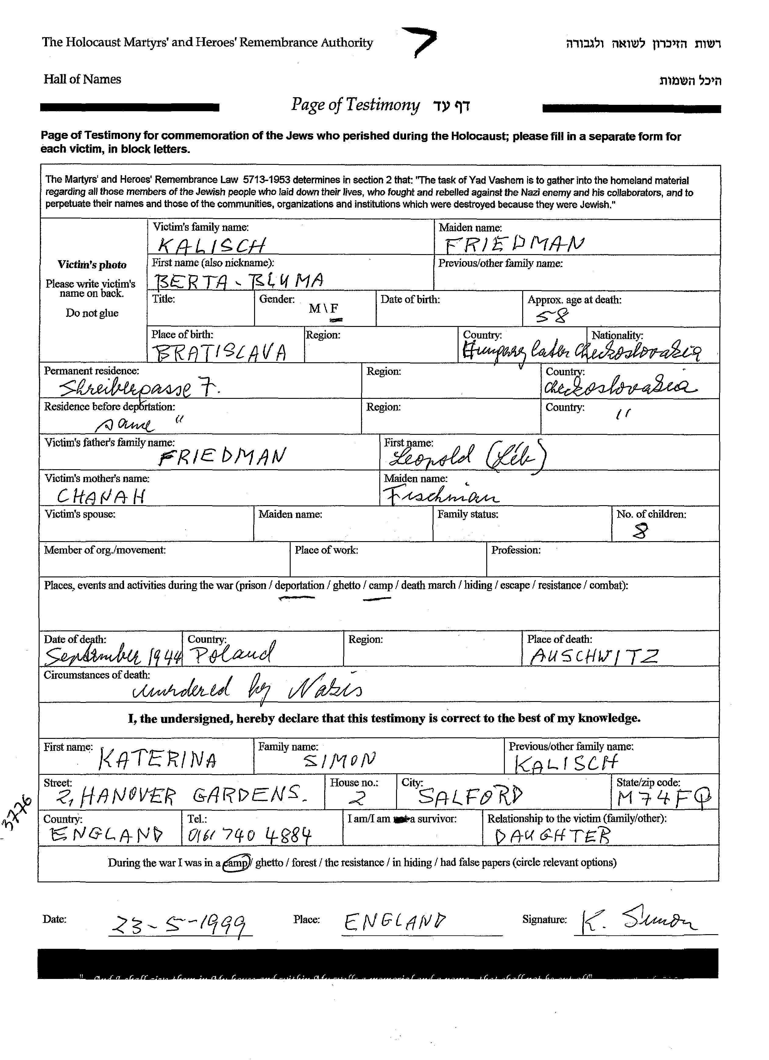 Kalisch Berta Bluma Bratislava, Tchécoslovaquie Feuille de témoignage