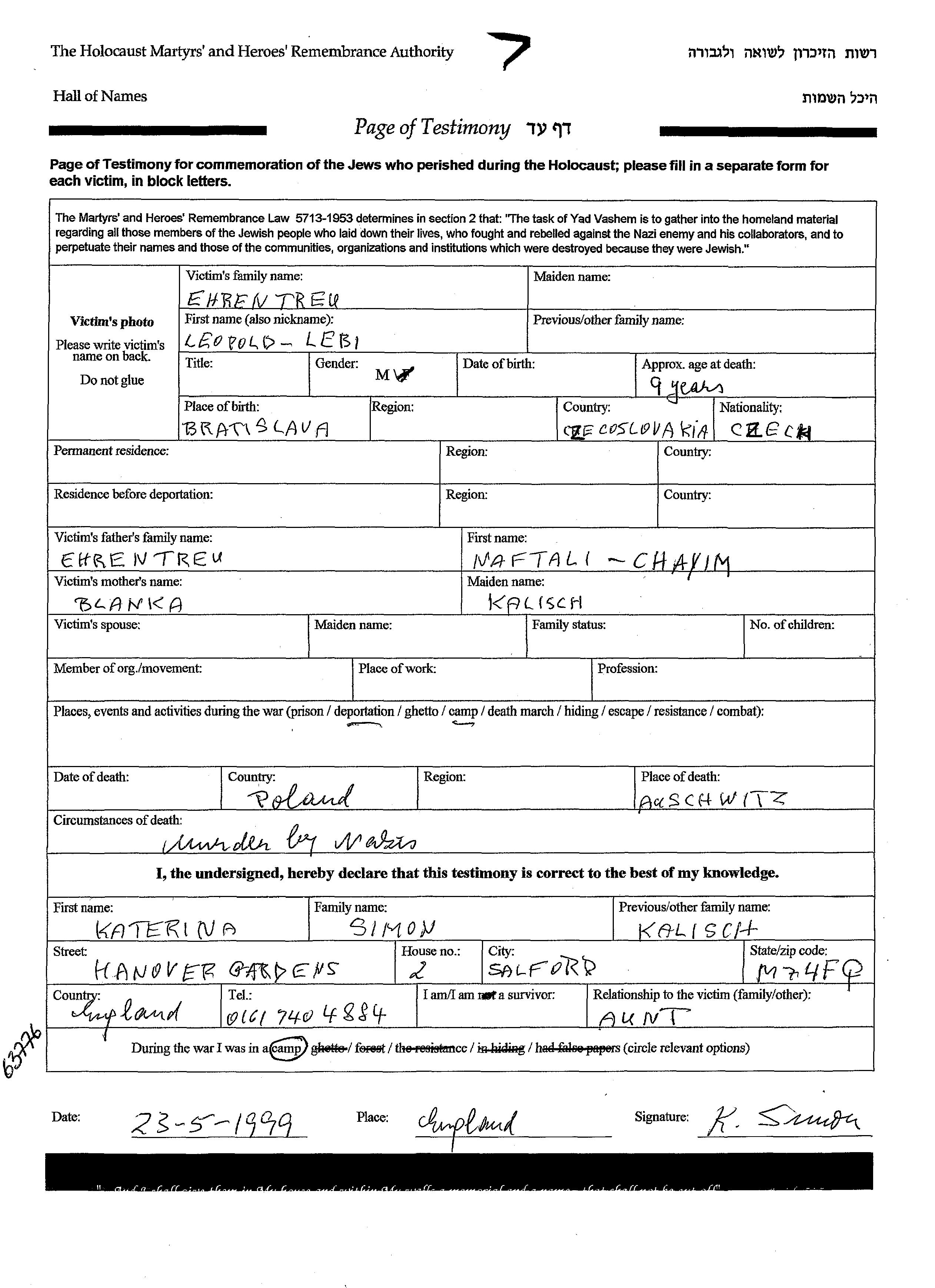 Ehrentreu Leopold Lebi endroit inconnu, Feuille de témoignage