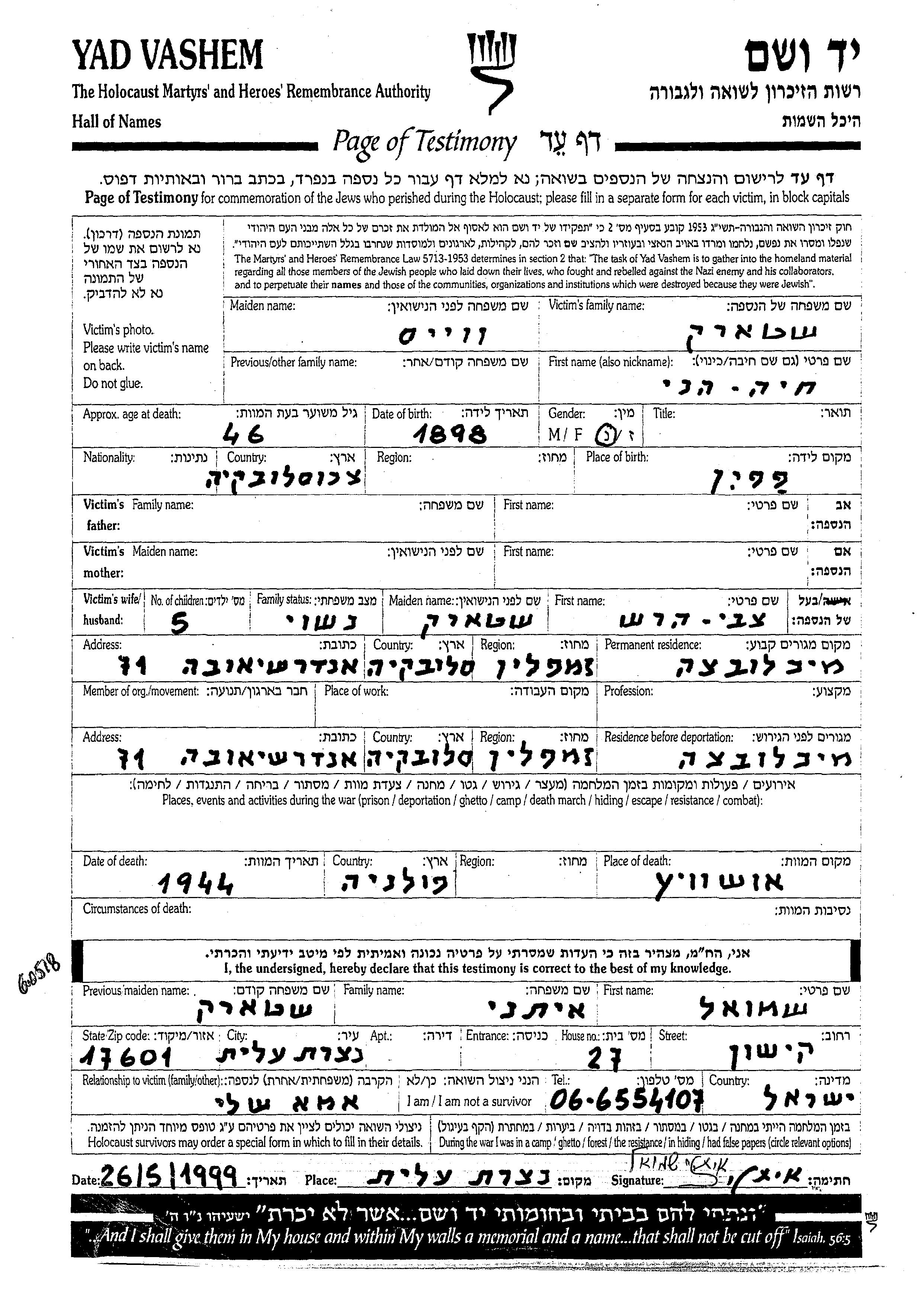 Yad Vashem - Pages of Testimony Names Memorial Collection
