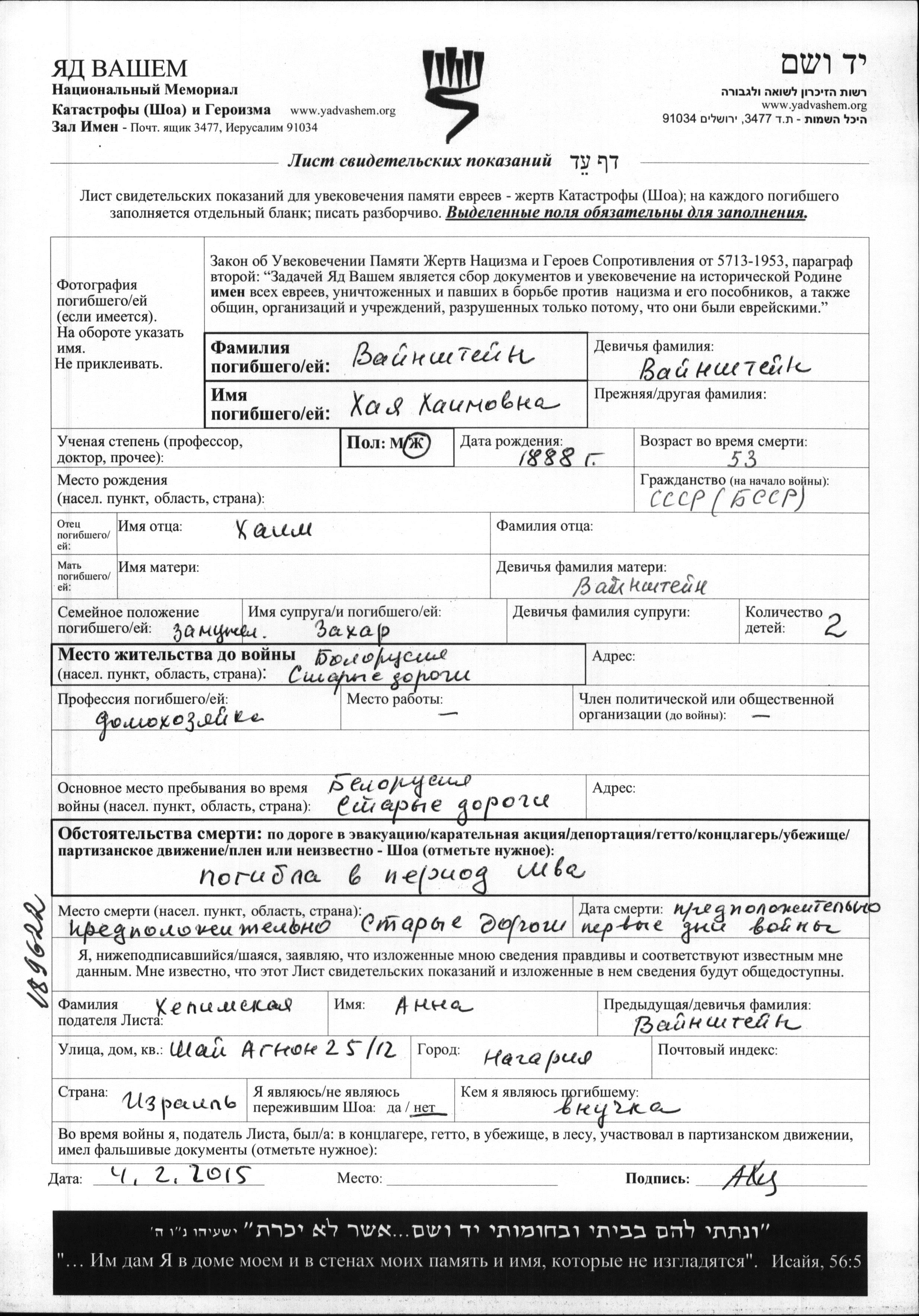 Vaynshteyn Khaya 1888 Staryye Dorogi, Bélorussie (URSS) Feuille de témoignage
