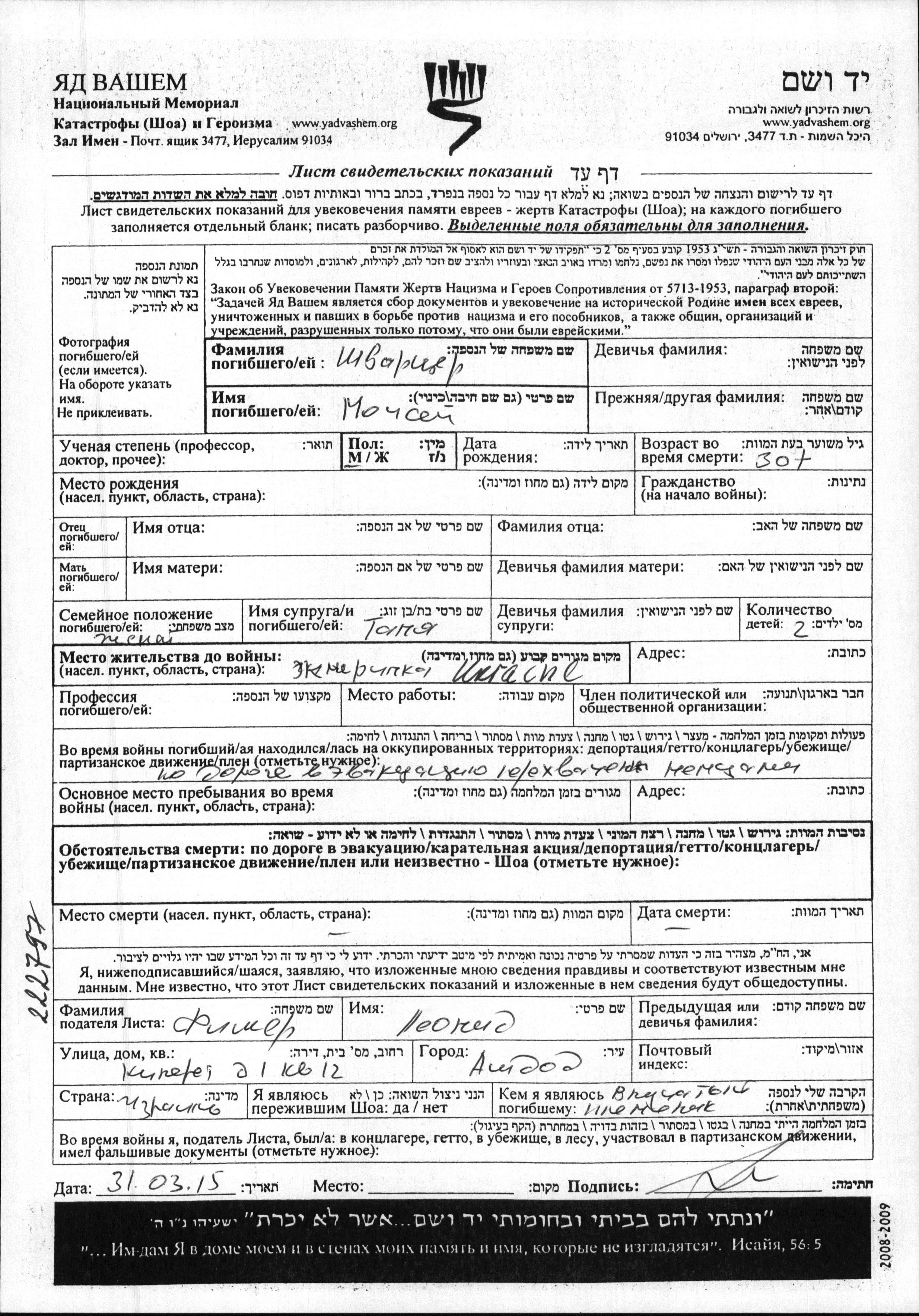 Shvartzer Moisey Zhmerinka, Ukraine (URSS) Feuille de témoignage