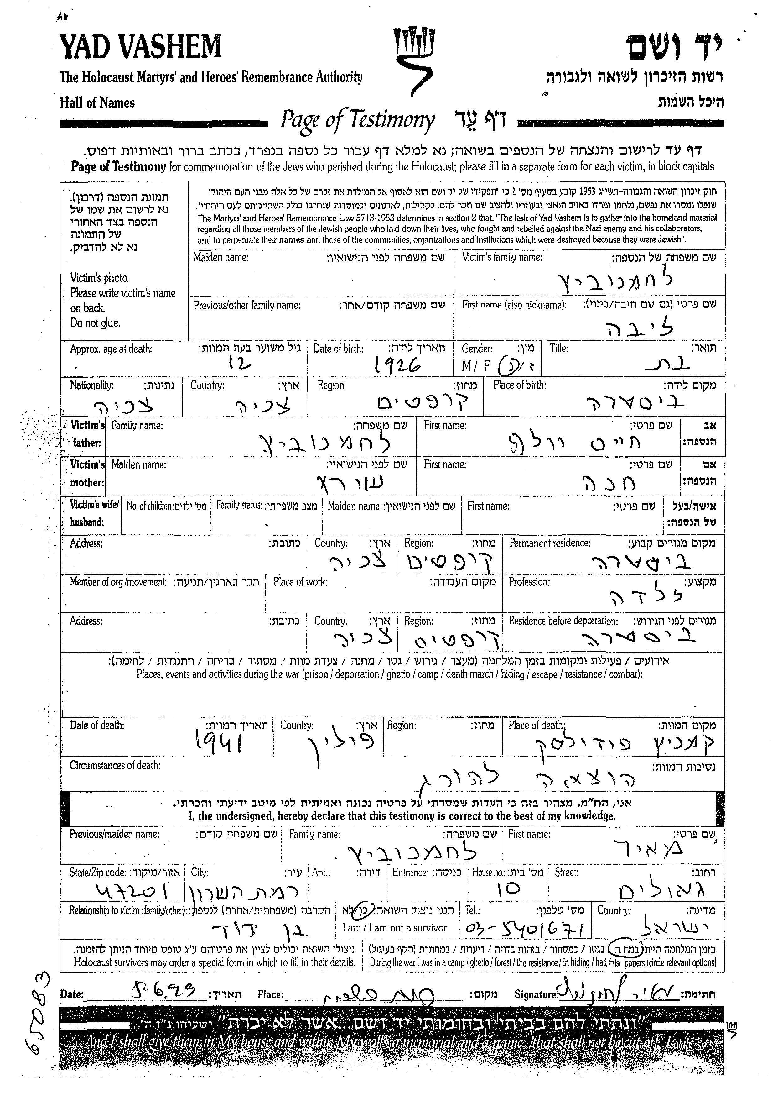 Yad Vashem - Pages of Testimony Names Memorial Collection