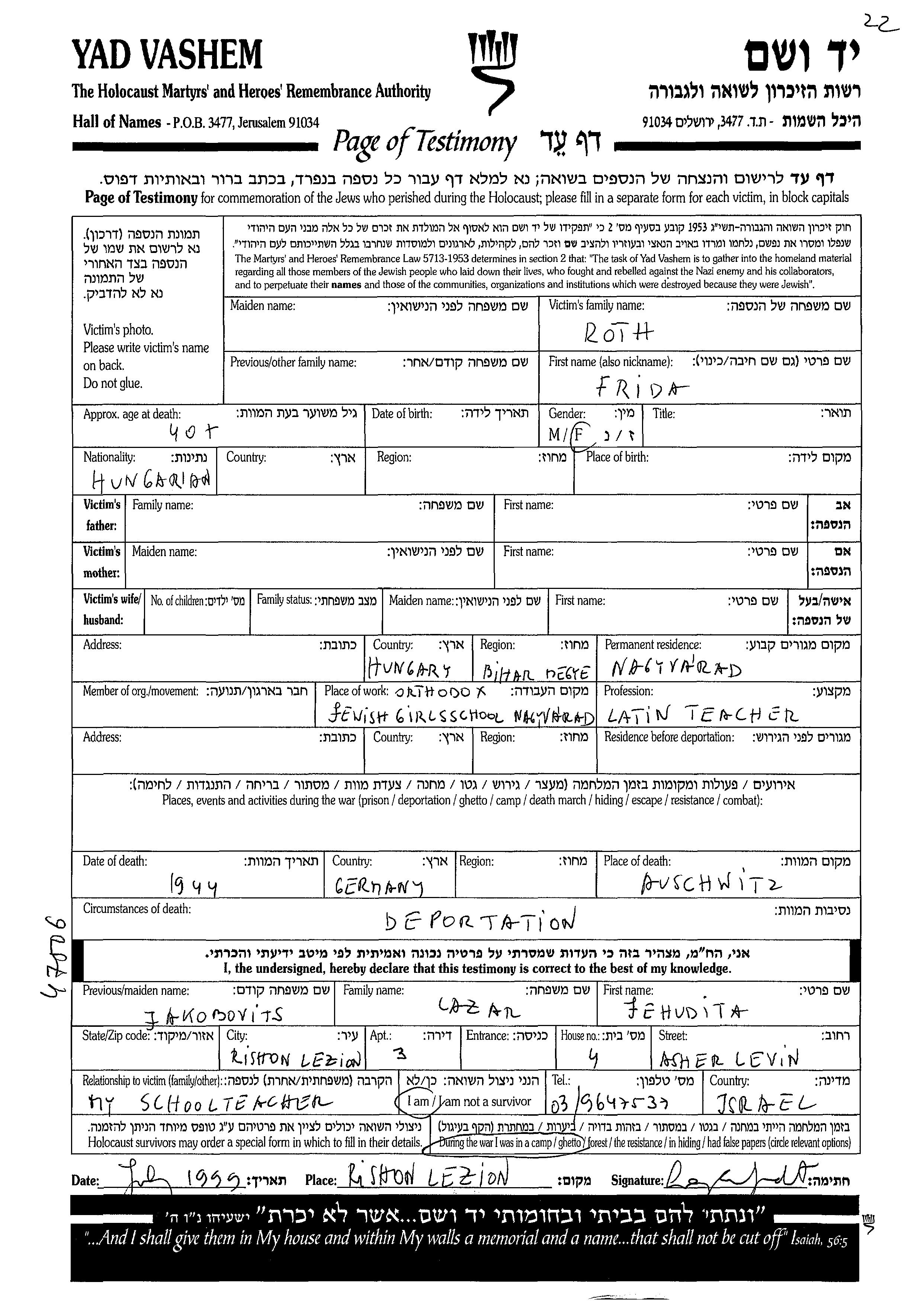 Roth Frida Nagyvarad, Roumanie Feuille de témoignage