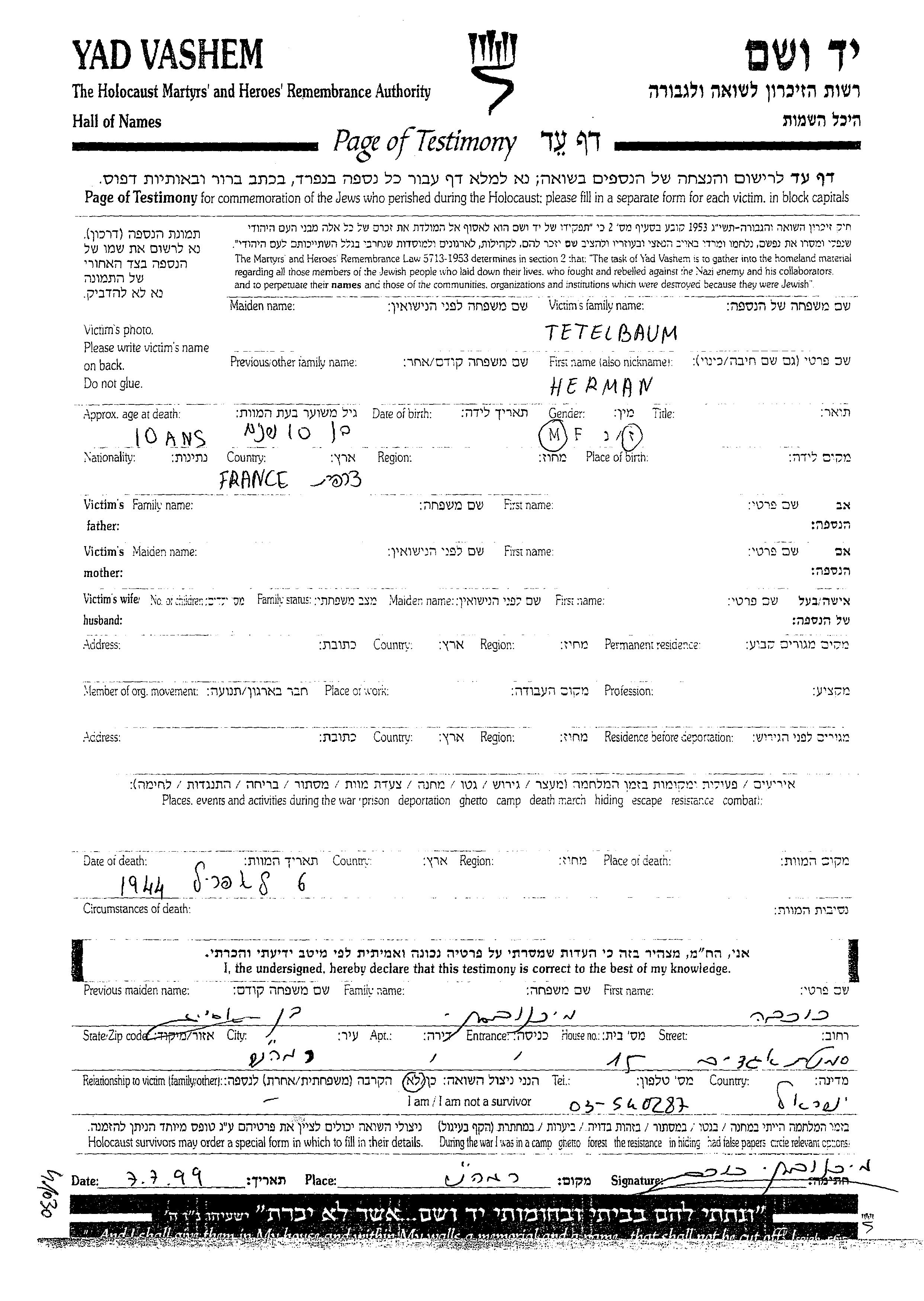 Tetelbaum Herman endroit inconnu, Feuille de témoignage