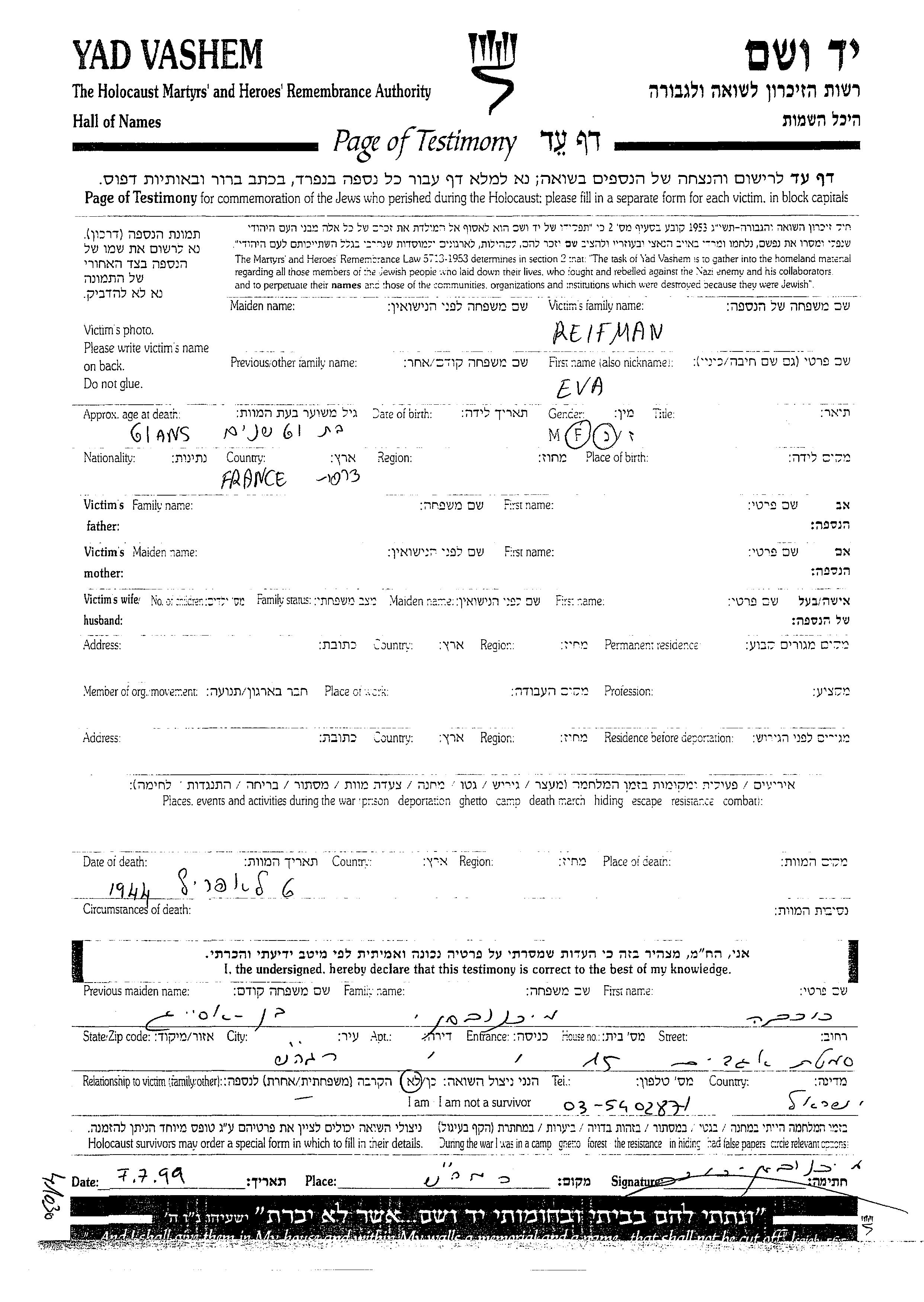 Reifman Eva endroit inconnu, Feuille de témoignage