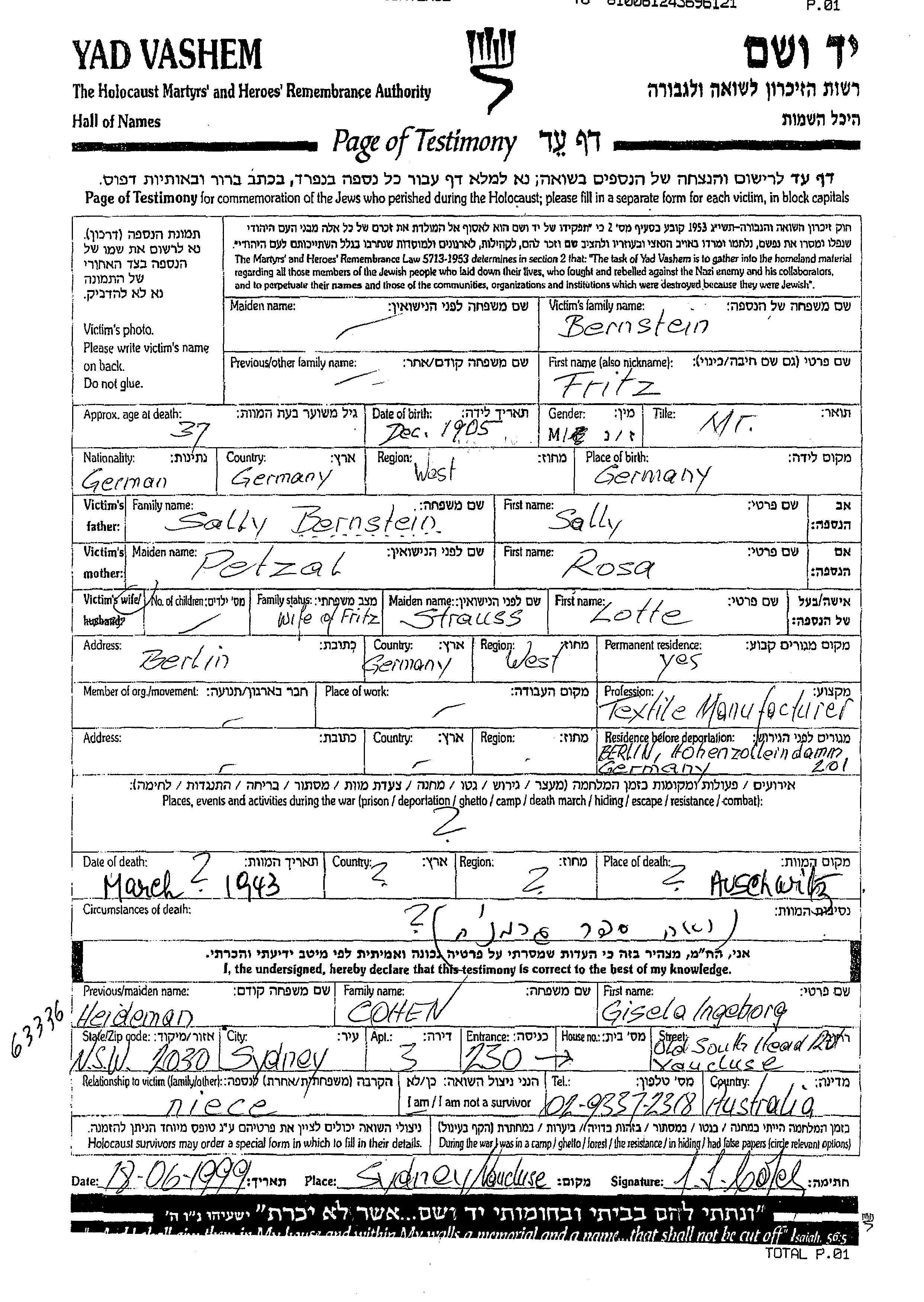 Bernstein Fritz 1905 Berlin, Allemagne Feuille de témoignage