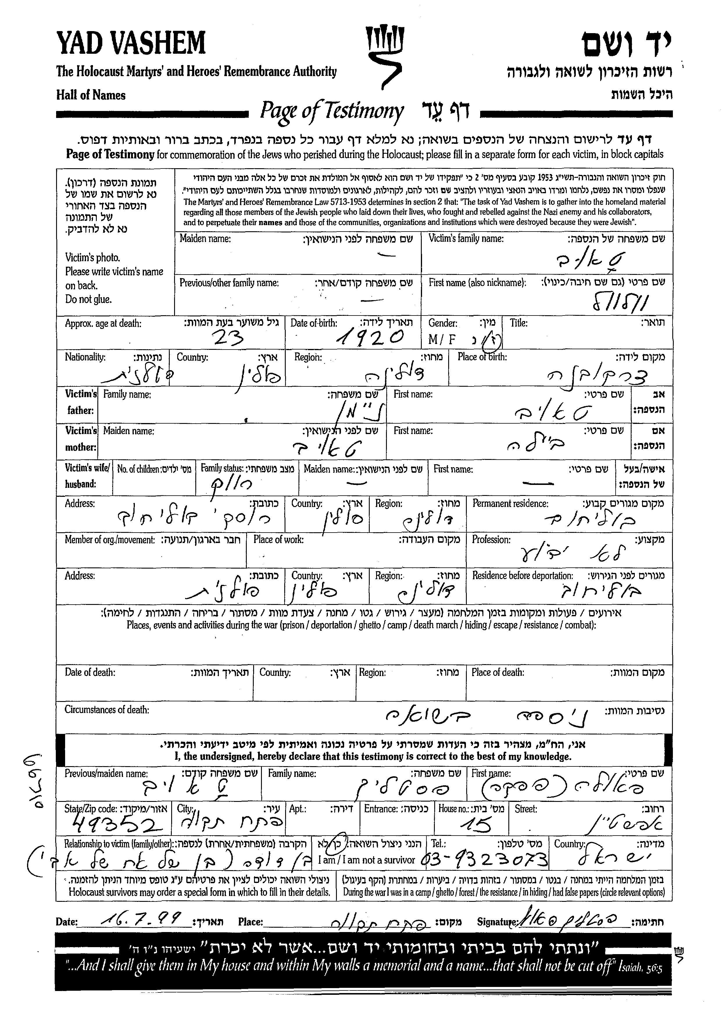 Yad Vashem - Pages of Testimony Names Memorial Collection