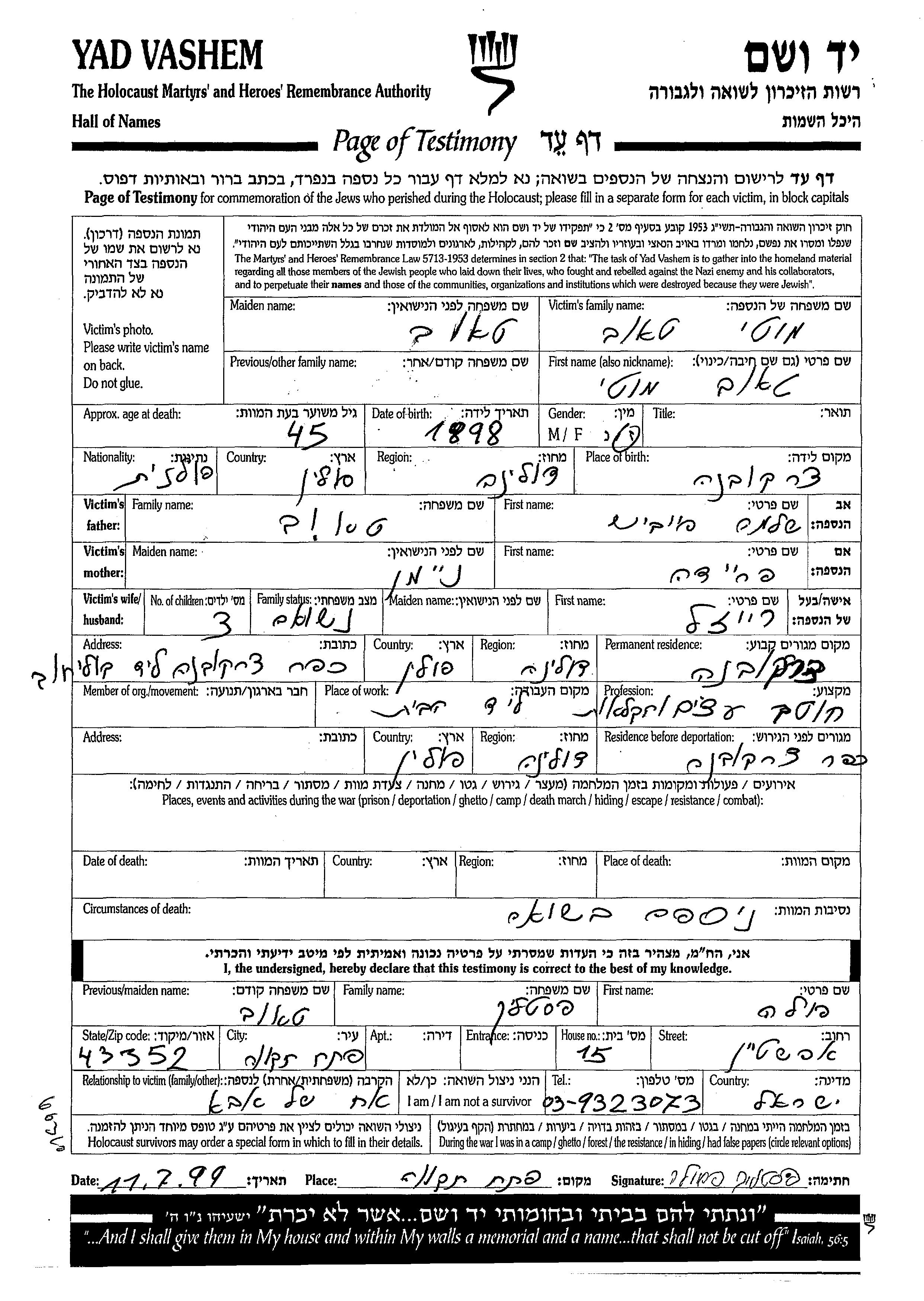 Yad Vashem - Pages of Testimony Names Memorial Collection