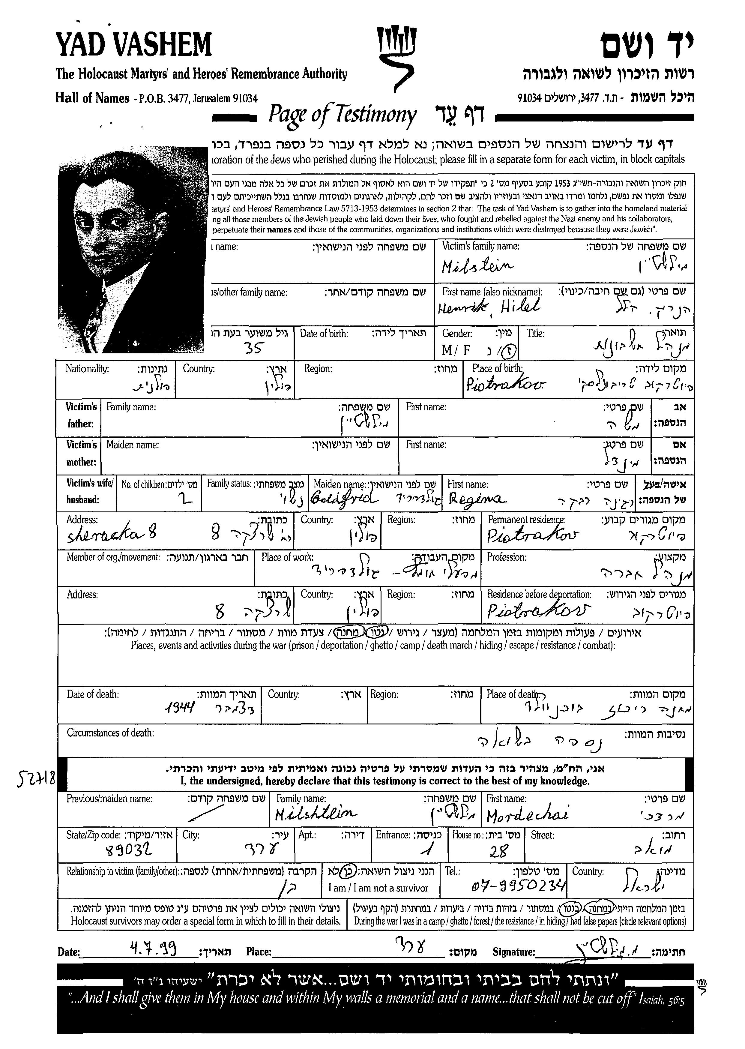 Milsztajn Henryk Hilel 1902 Piotrkow Trybunalski, Pologne Feuille de témoignage