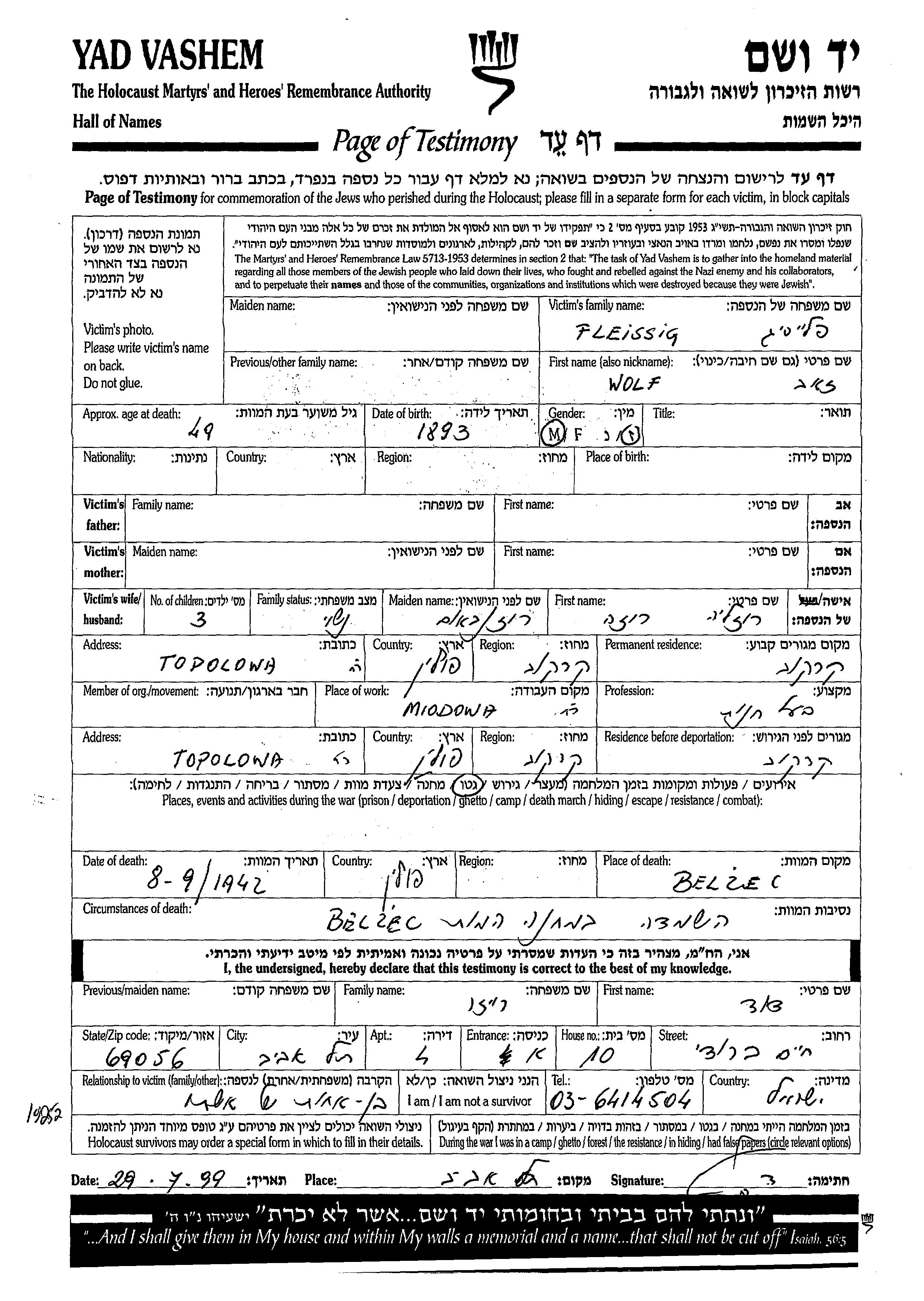Fleissig Wolf Zeev 1893 Krakow, Pologne Feuille de témoignage