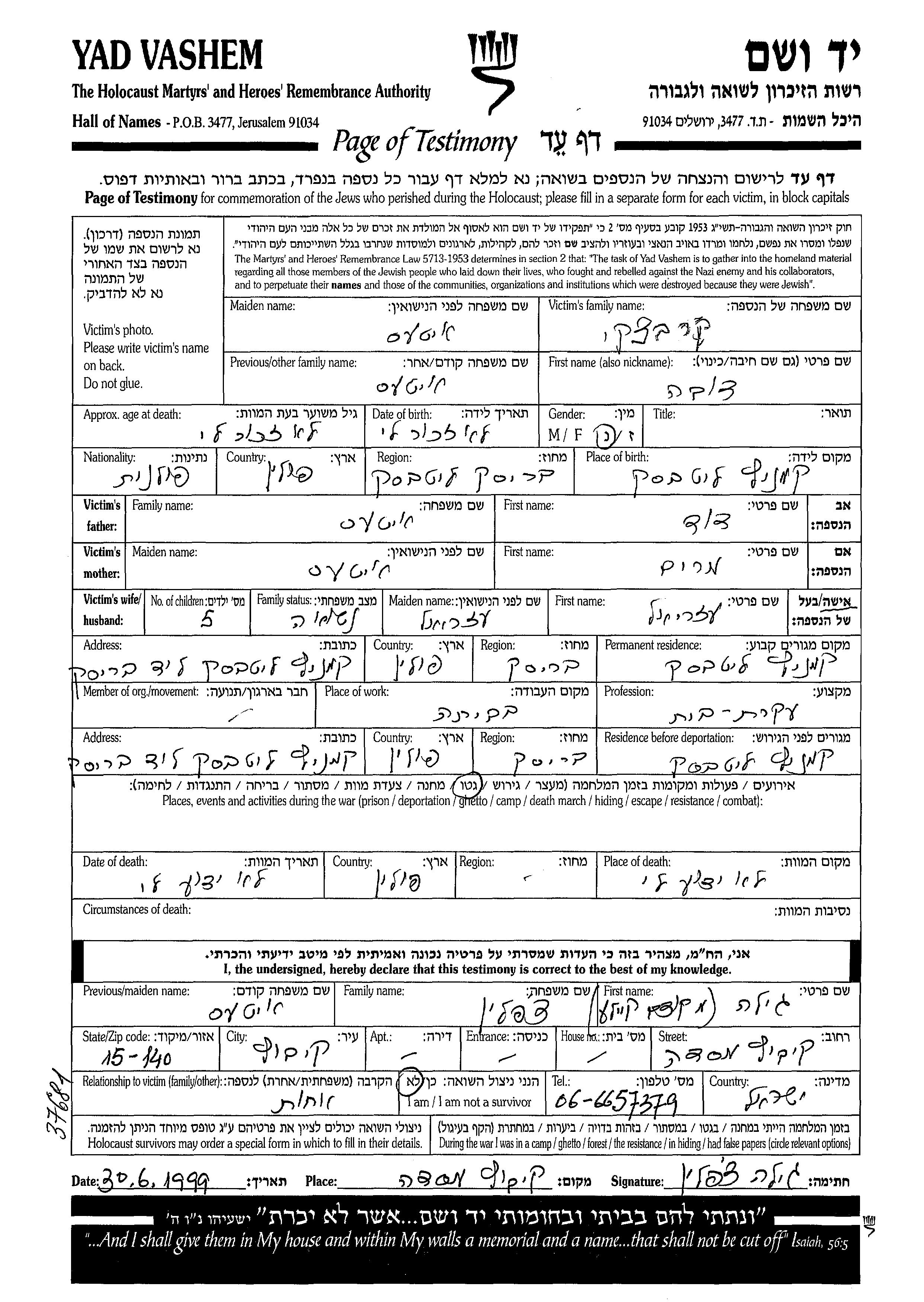 Yad Vashem - Pages of Testimony Names Memorial Collection