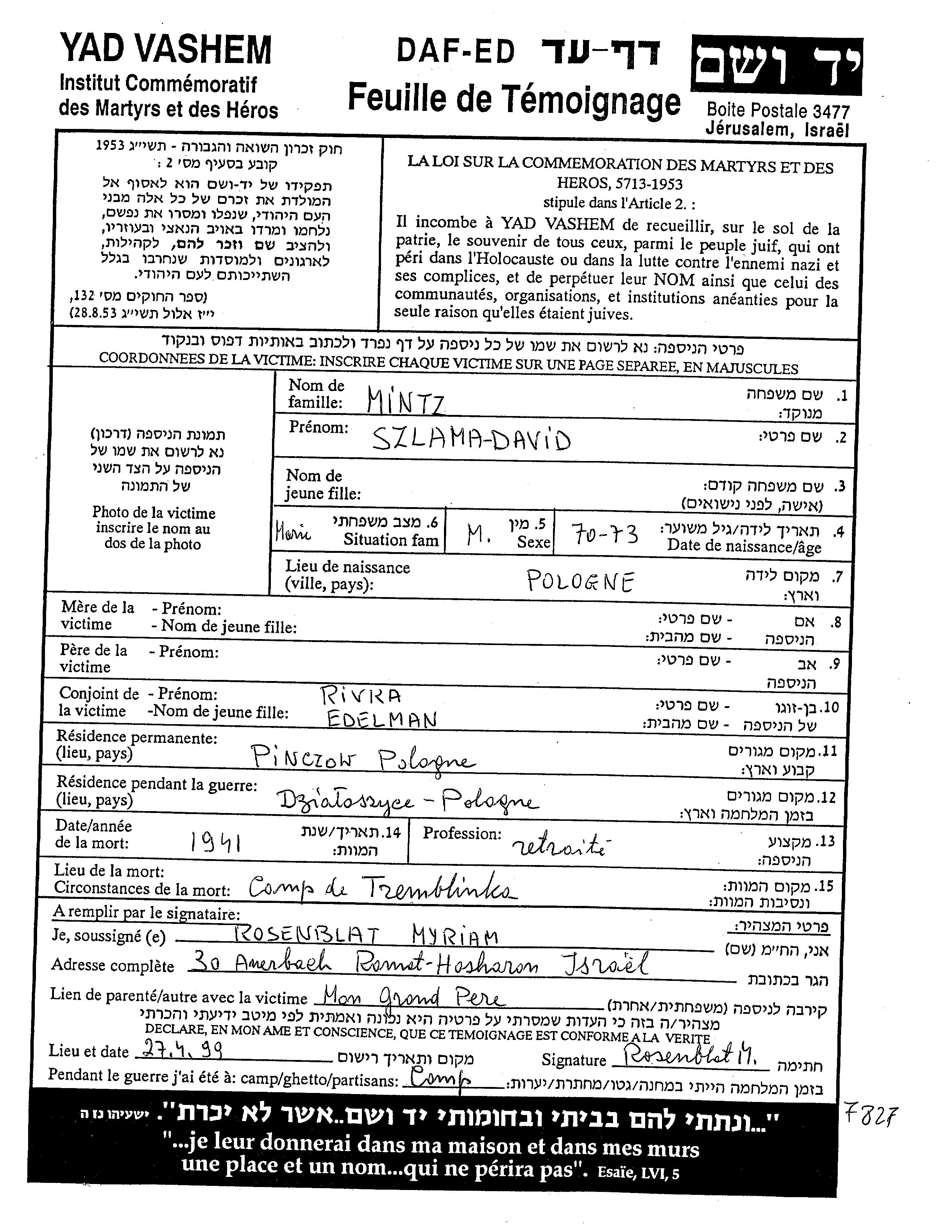 Mintz Szlama David Pinczow, Pologne Feuille de témoignage