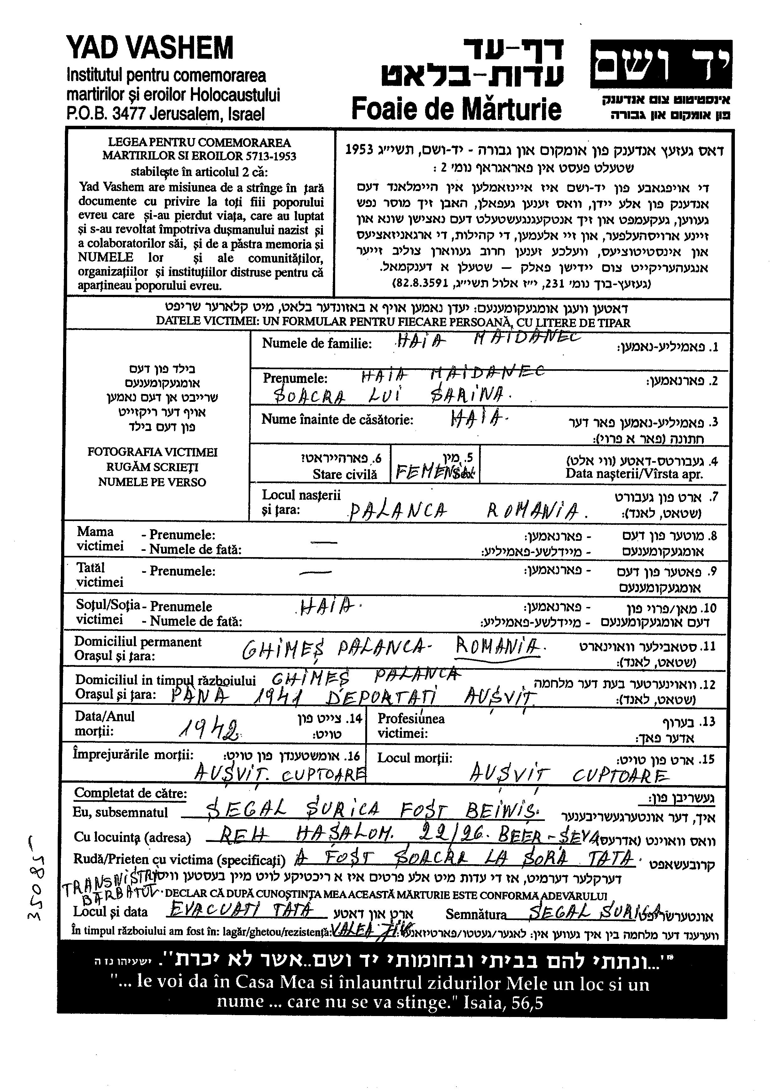 Maidanec Haia Ghimes Palanca, Roumanie Feuille de témoignage