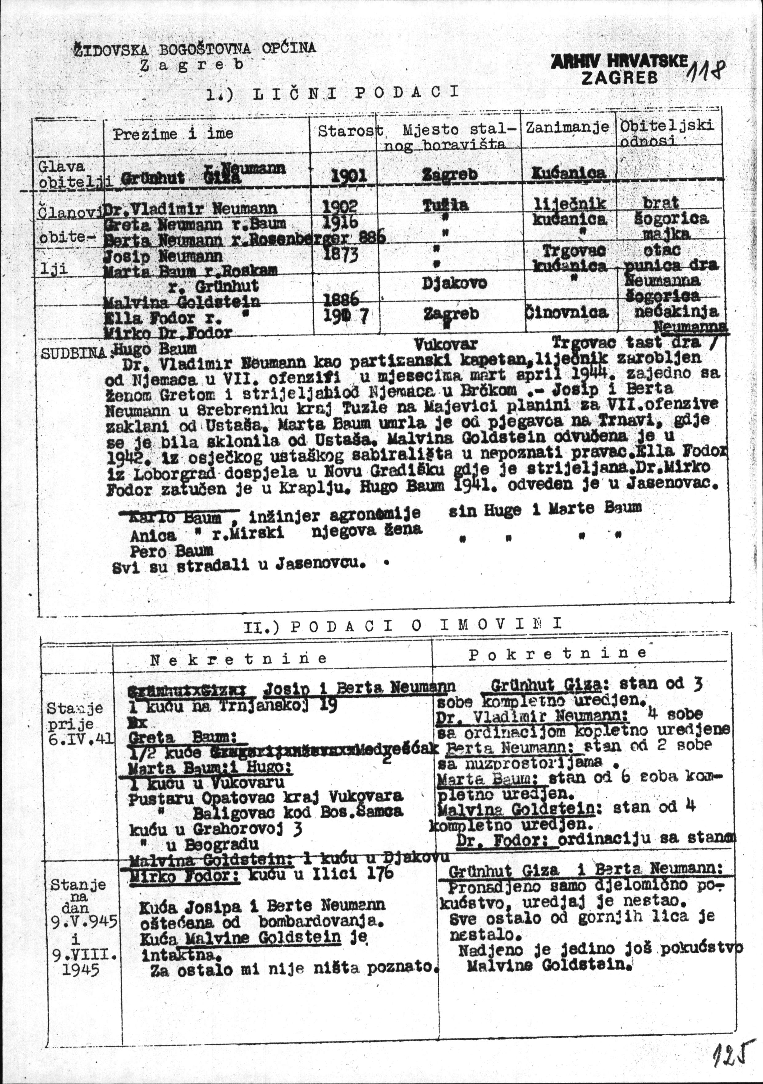 List of Jews from Zagreb and the surrounding area including their fate and details of the damage caused to their property, Letters A-W, 1945