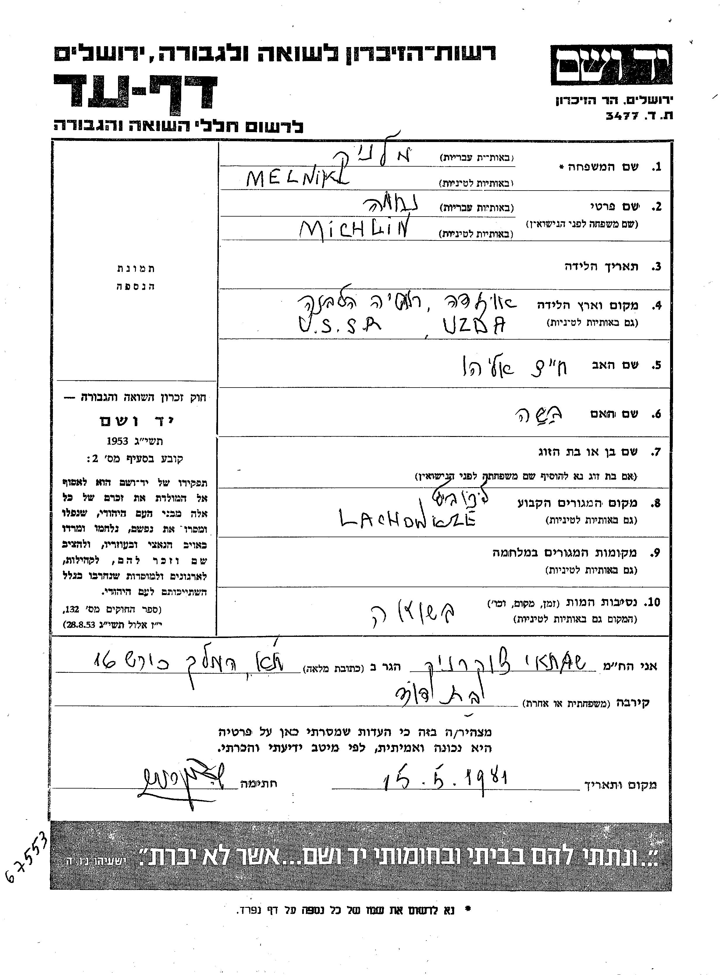 Melnik Nekhama Lachowicze, Pologne Feuille de témoignage