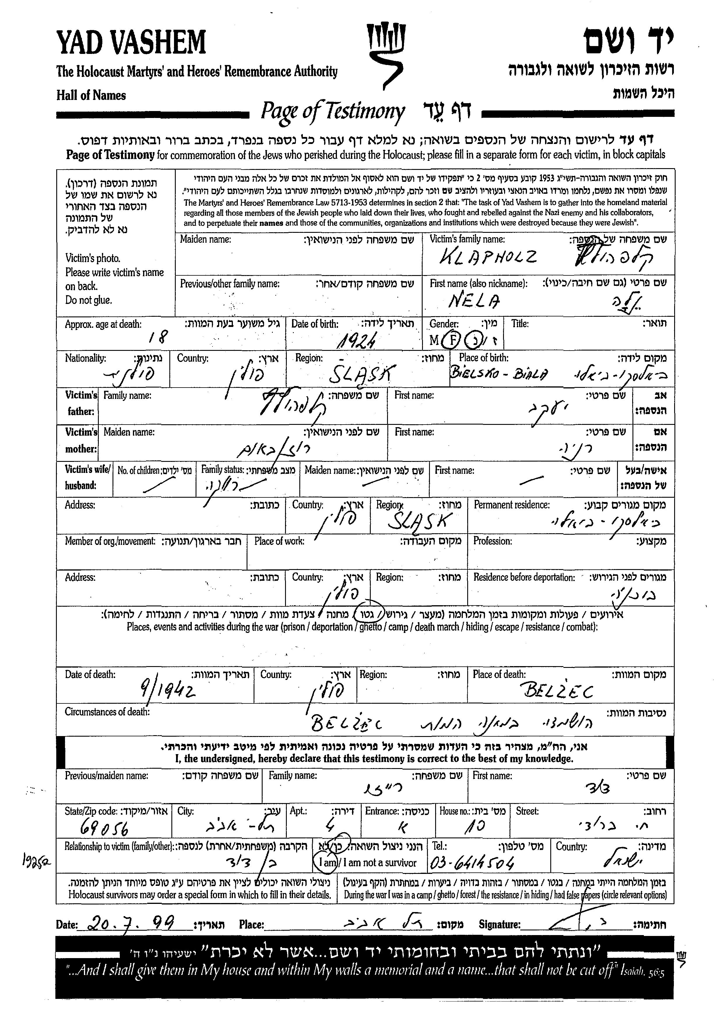 Klapholz Nela 1924 Bielsko Biala, Pologne Feuille de témoignage