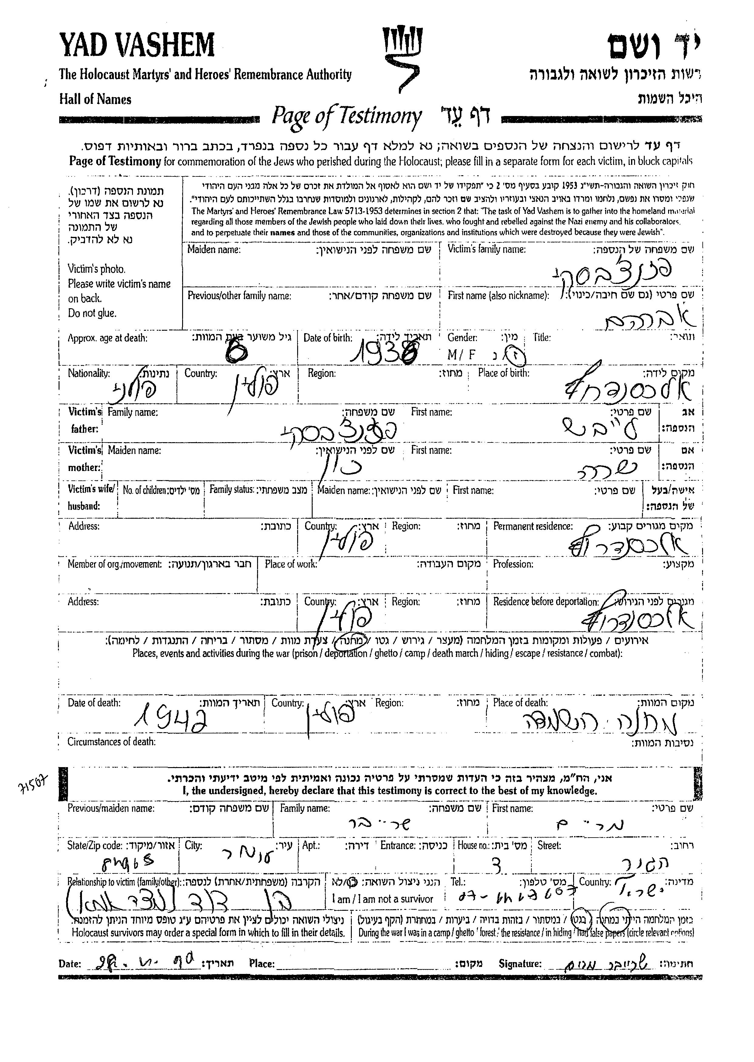 Yad Vashem - Pages of Testimony Names Memorial Collection