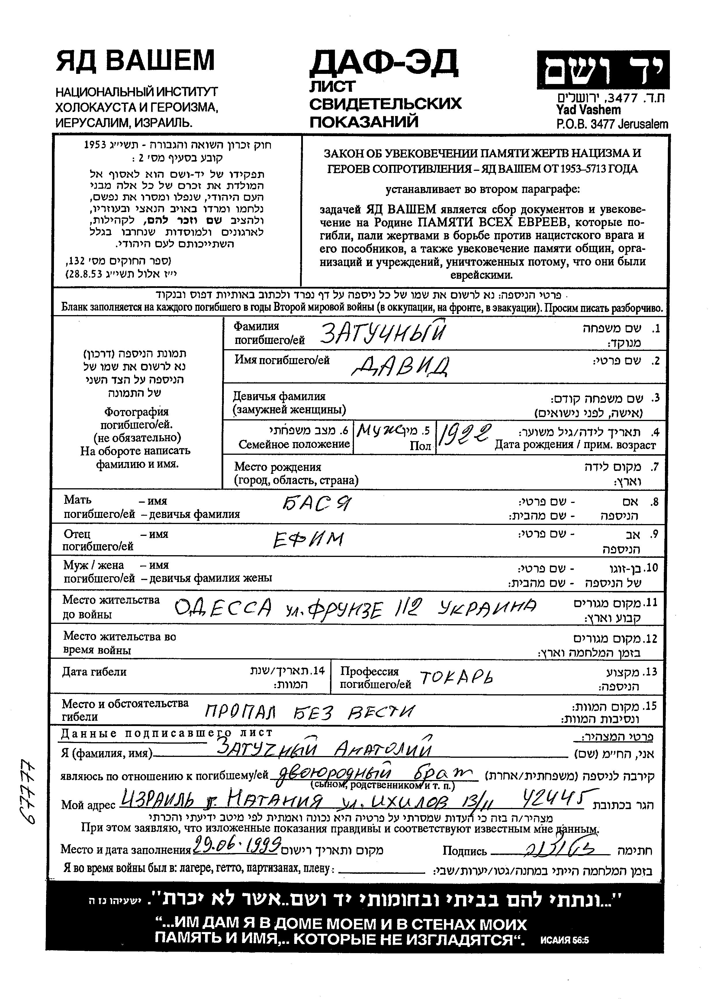 Zatuchny David 1922 Odessa, Ukraine (URSS) Feuille de témoignage