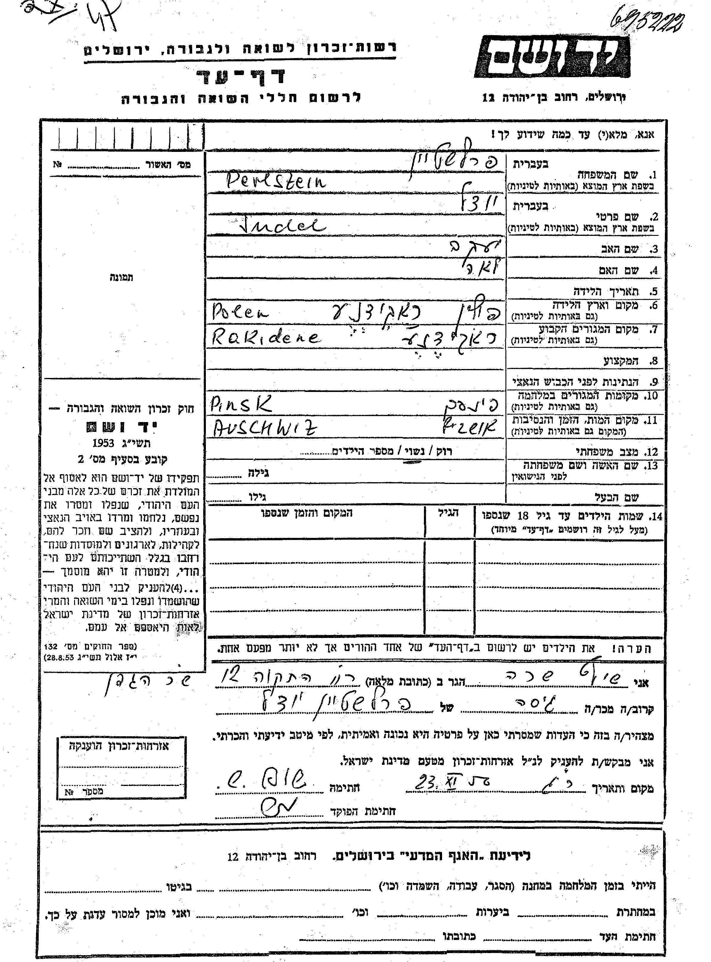 Judel Perlstein est né à Rokitno, Pologne, fils de Yaakov et de Lea. Il était Marié. Avant la seconde guerre mondiale il vivait à Pinsk, Pologne. Au cours de la guerre, il était à Auschwitz, Pologne.