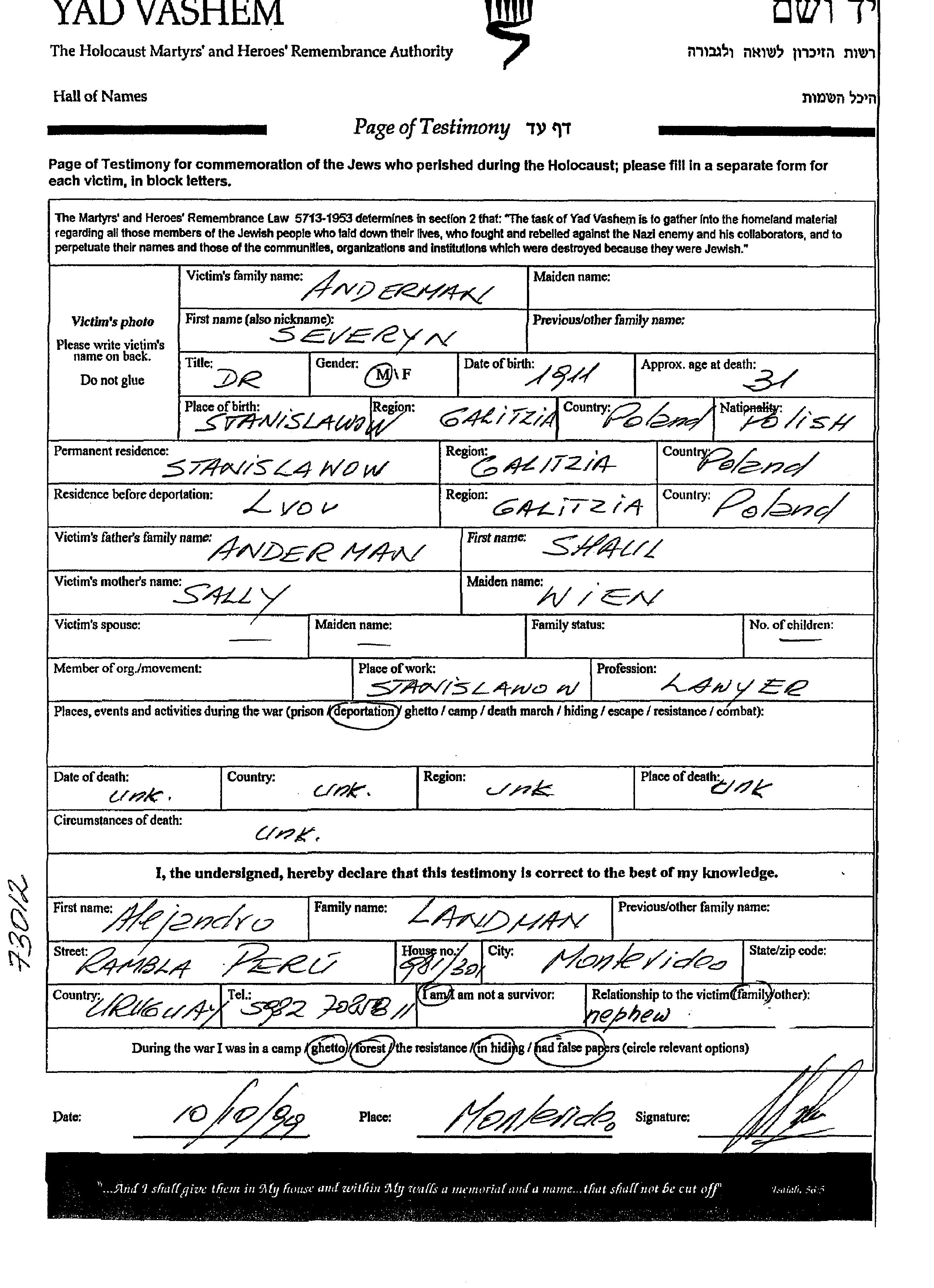 Anderman Severyn 1911 Stanislawow, Pologne Feuille de témoignage
