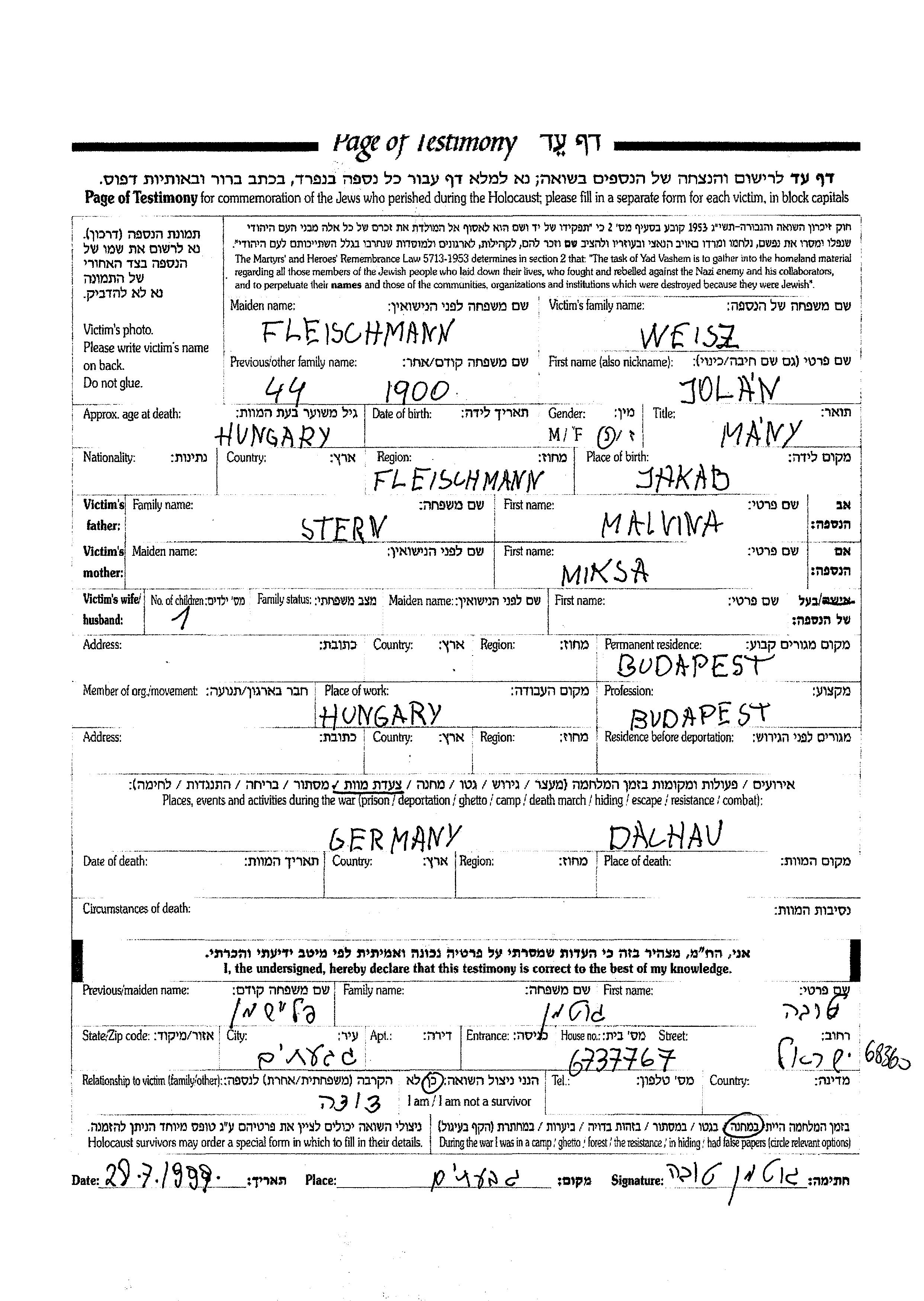 Yad Vashem - Pages of Testimony Names Memorial Collection