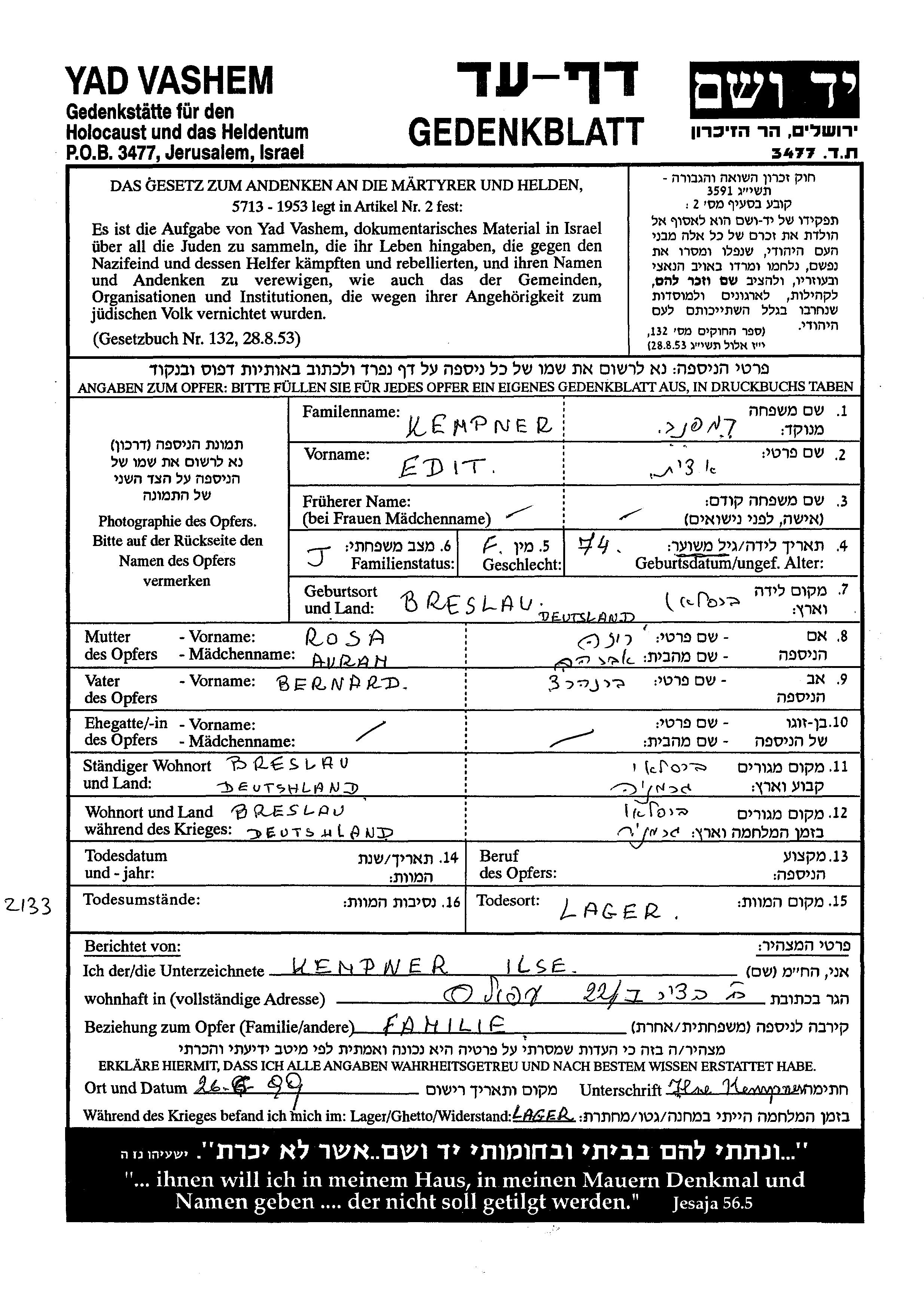 Edit Kempner est née à Breslau, Allemagne en 1925, fille de Bernard et de Rosa née Avram. Elle était Célibataire. Avant la seconde guerre mondiale elle vivait à Breslau, Allemagne. Pendant la guerre, elle était à Breslau, Allemagne.