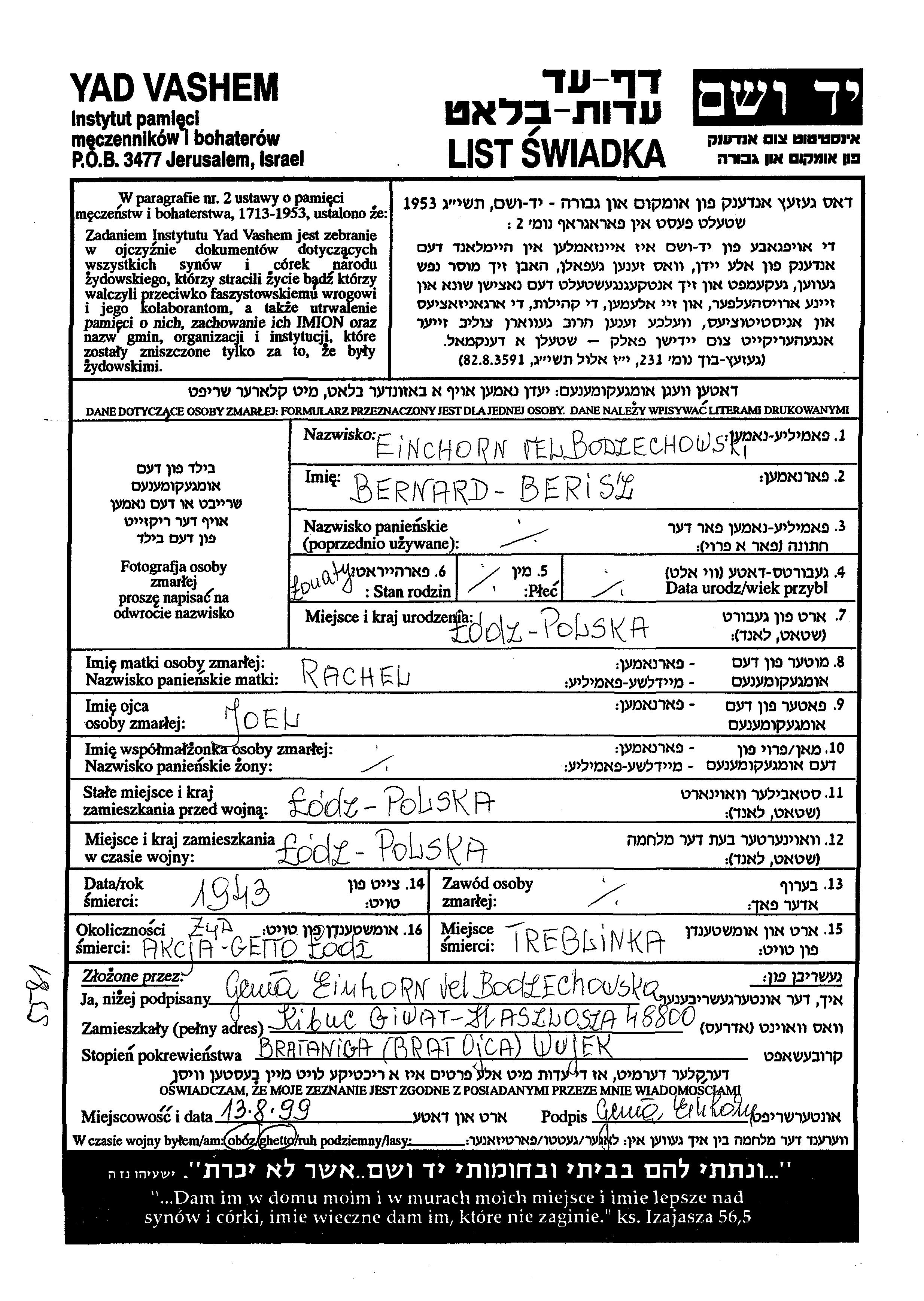 Einchorn Bodzechowski Bernard Berisz Lodz, Pologne Feuille de témoignage