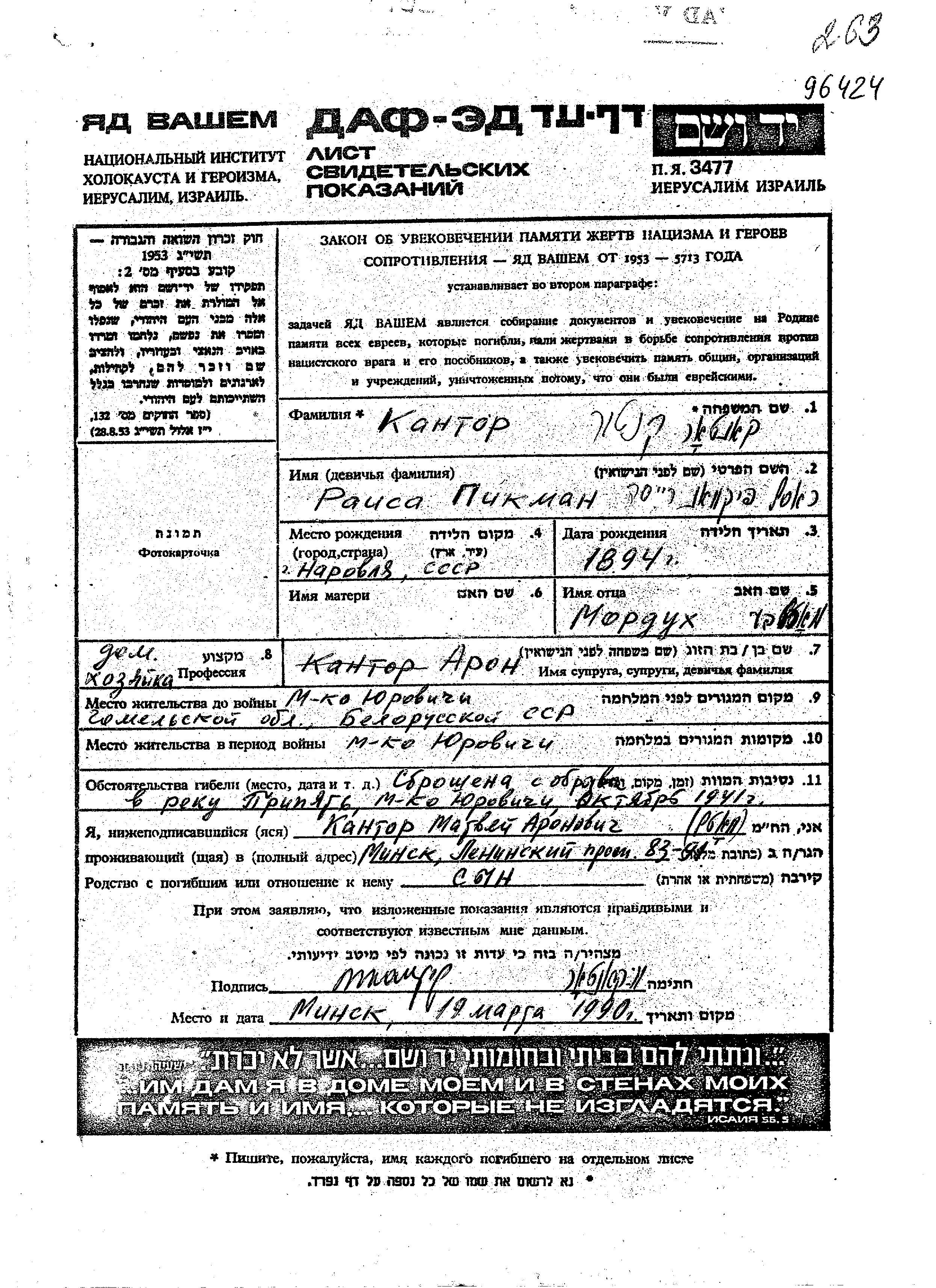 Kantor | Raisa Rasha | 1894 | Yurevichi, Bélorussie (URSS) | Feuille de témoignage |