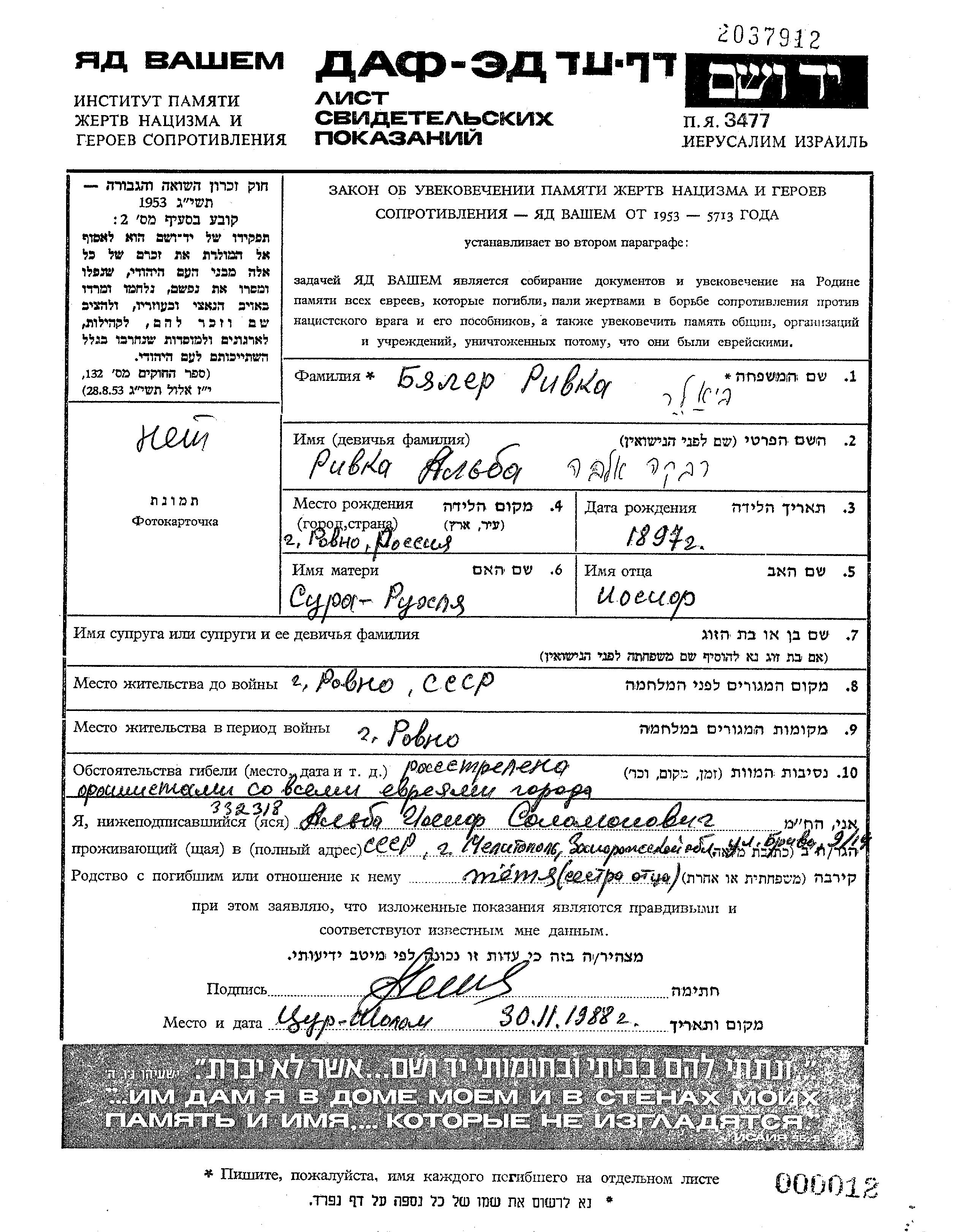 | Bialer Biler | Rivka | 1904 | Dubno, Pologne | Feuille de témoignage |