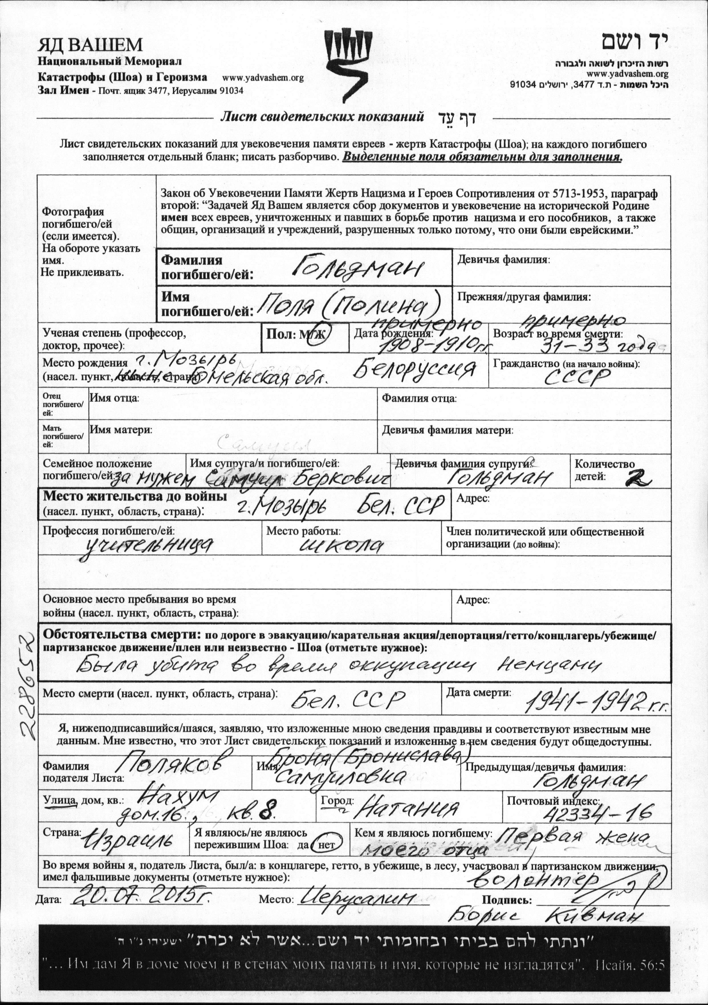 Polya Goldman est née à Mozyr, Bélorussie (URSS) en 1908. Elle était Enseignant/e et Mariée à Samuil. Avant la seconde guerre mondiale elle vivait à Mozyr, Bélorussie (URSS). Pendant la guerre, elle était à Mozyr, Bélorussie (URSS).