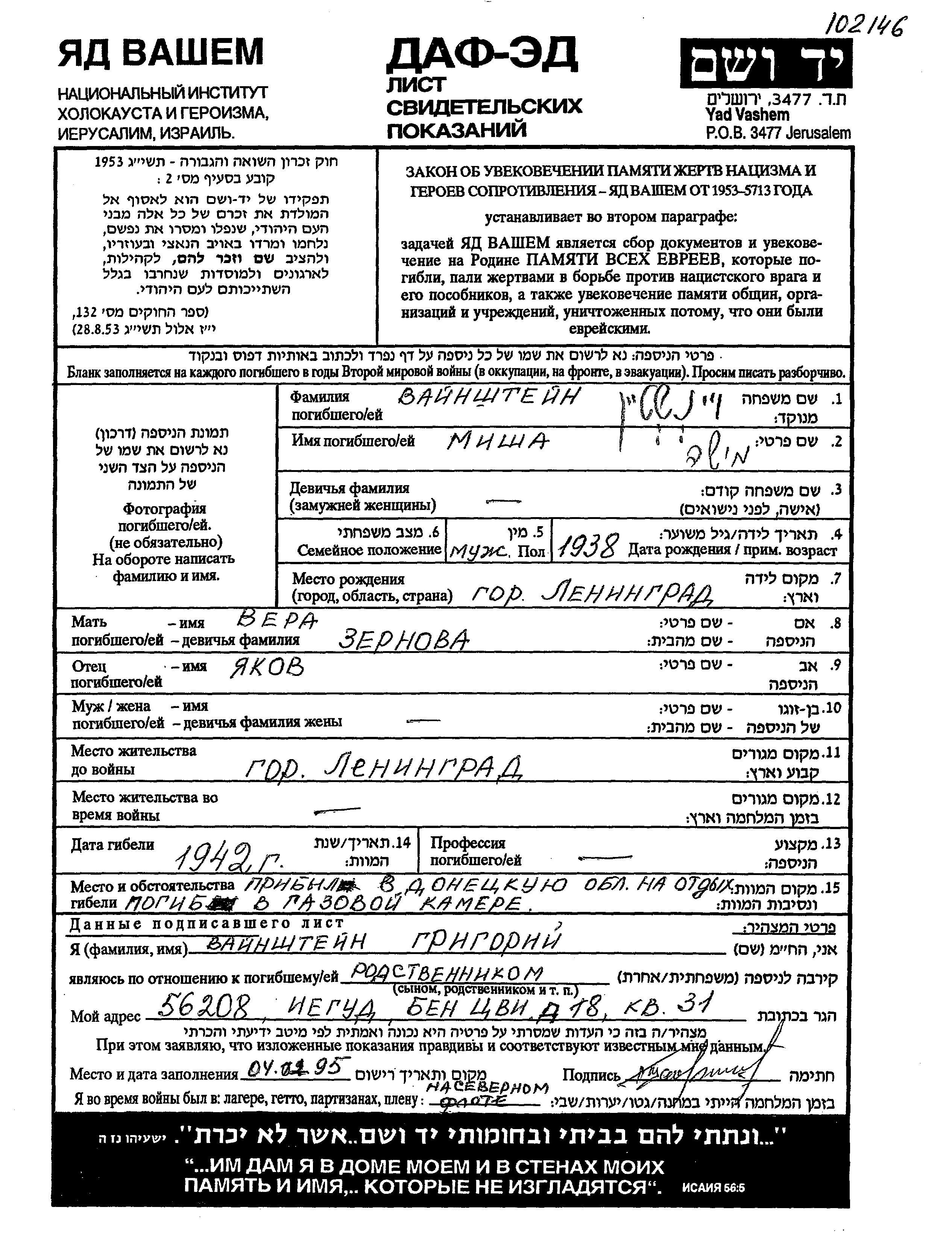 Vaynshteyn Misha 1938 Leningrad, Russie (URSS) Feuille de témoignage
