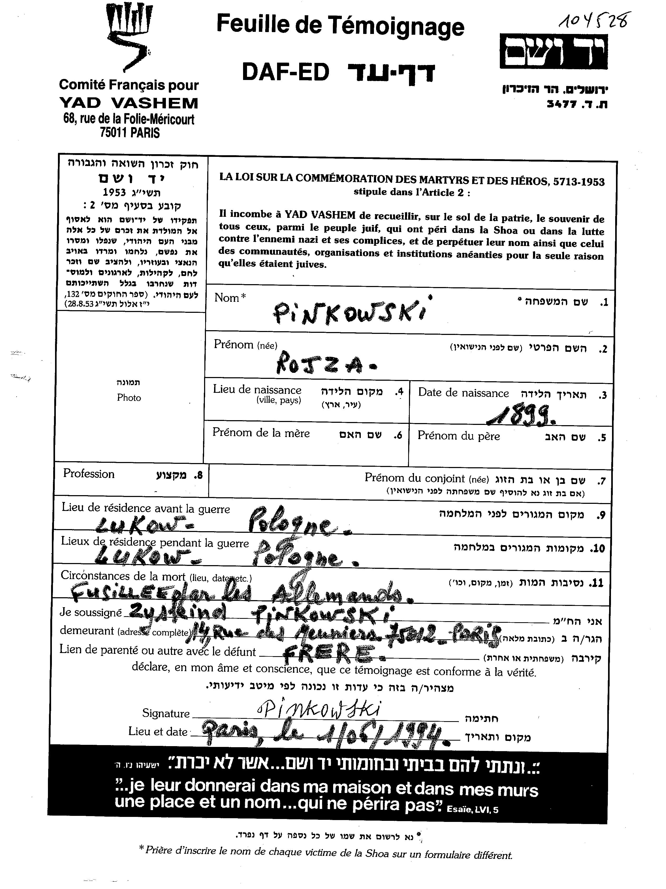 Pinkowski Rojza 1899 Lukow, Pologne Feuille de témoignage