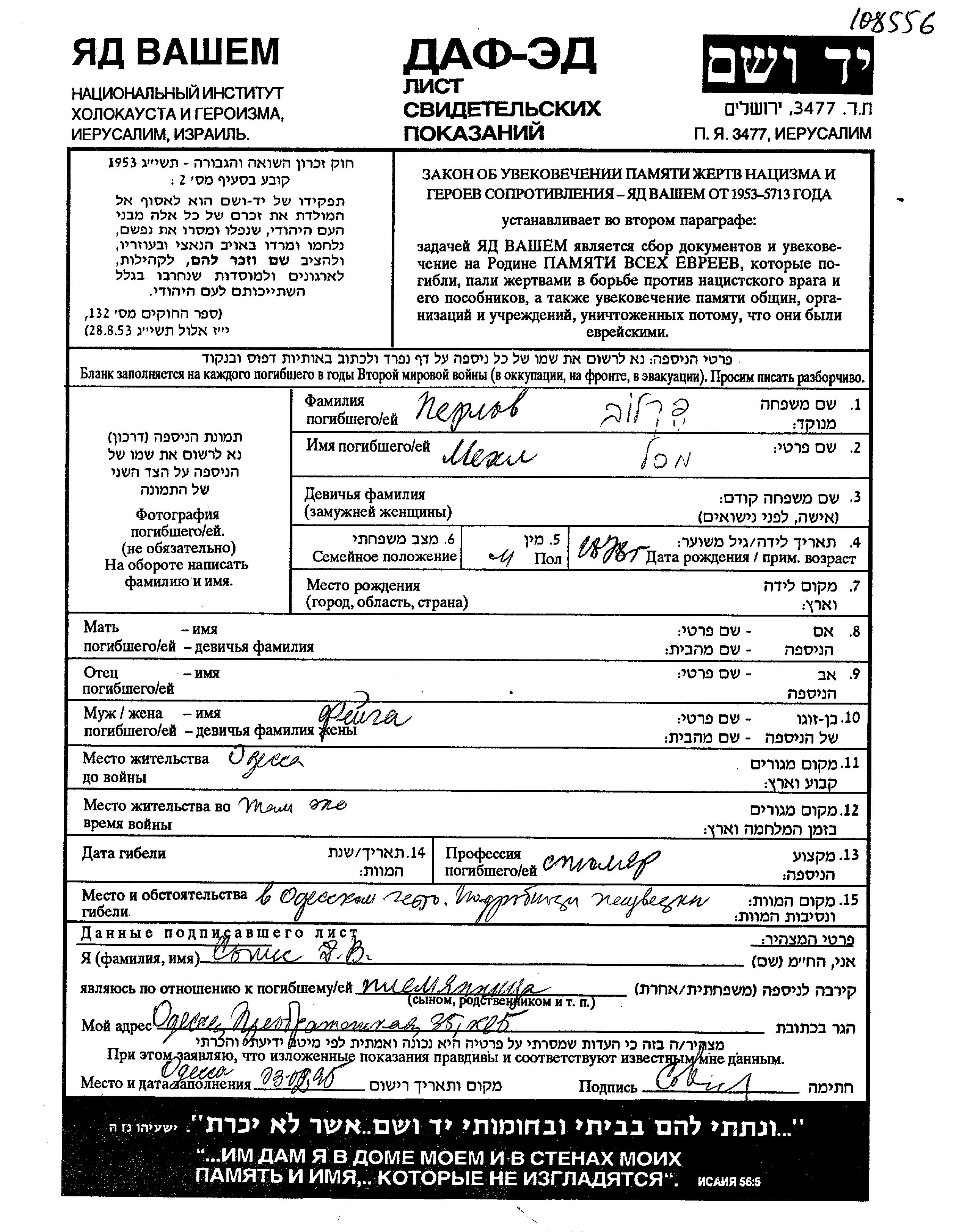 Yad Vashem - Pages of Testimony Names Memorial Collection