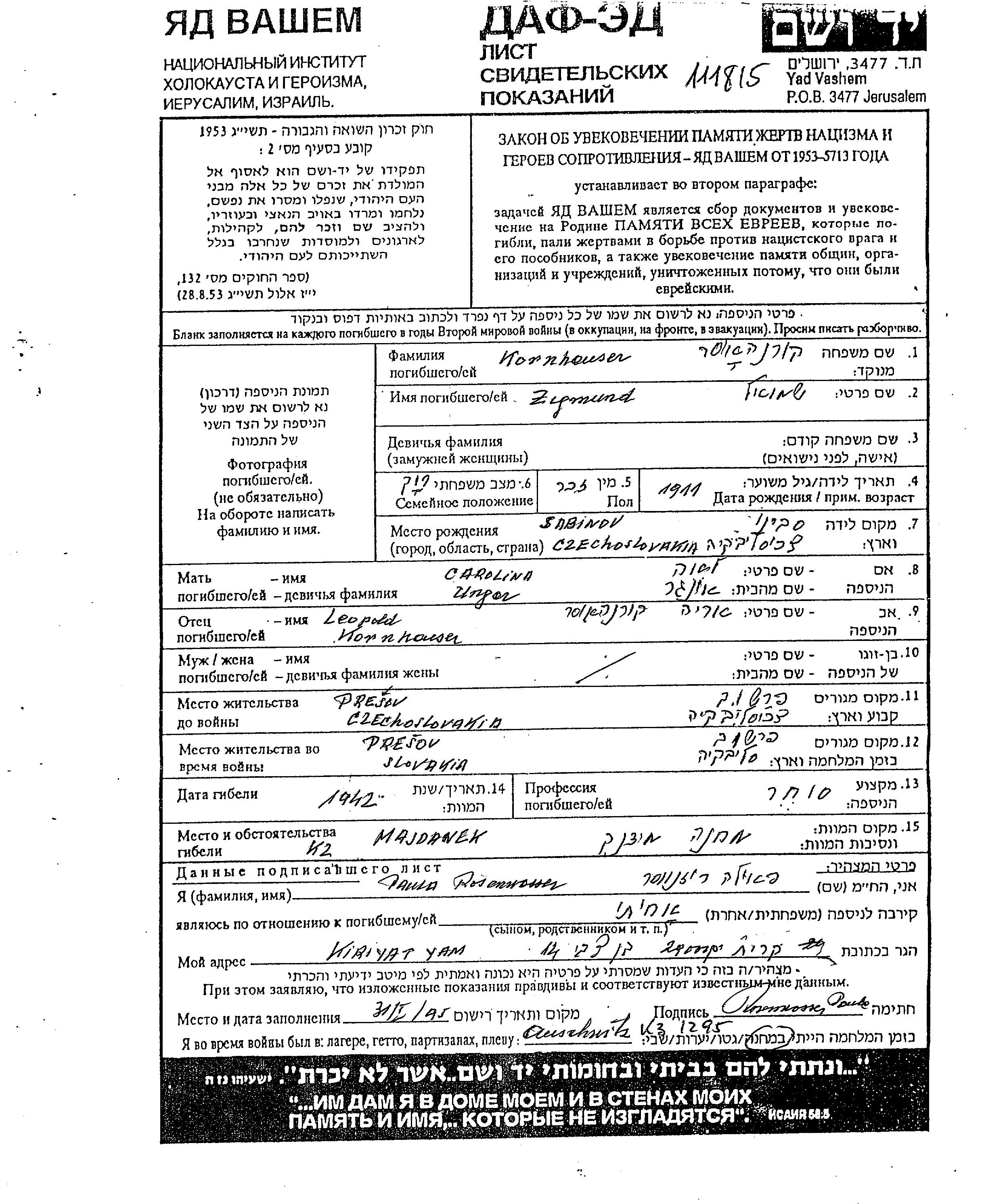 Kornhauser Zygmund Shmuel 1911 Presov, Tchécoslovaquie Feuille de témoignage