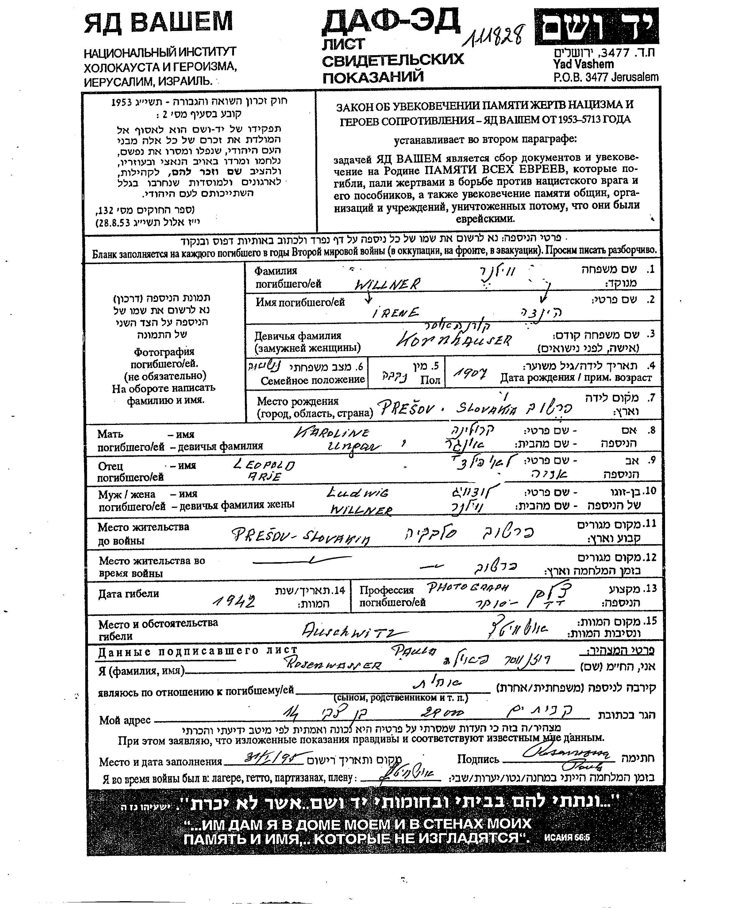 Willner Irene Hinda 1907 Presov, Tchécoslovaquie Feuille de témoignage