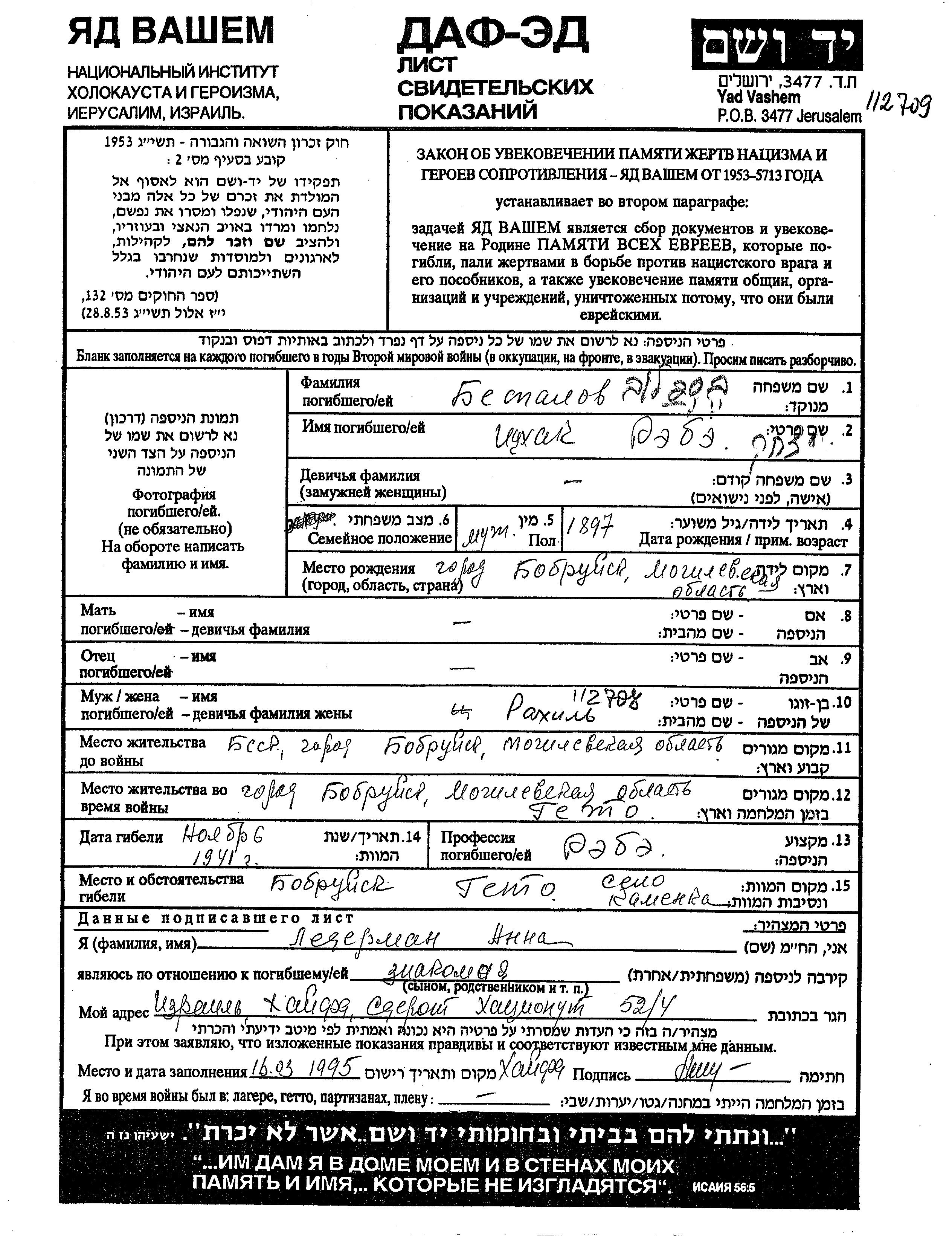 Bespalov Yitzkhak 1897 Bobruysk, Bélorussie (URSS) Feuille de témoignage
