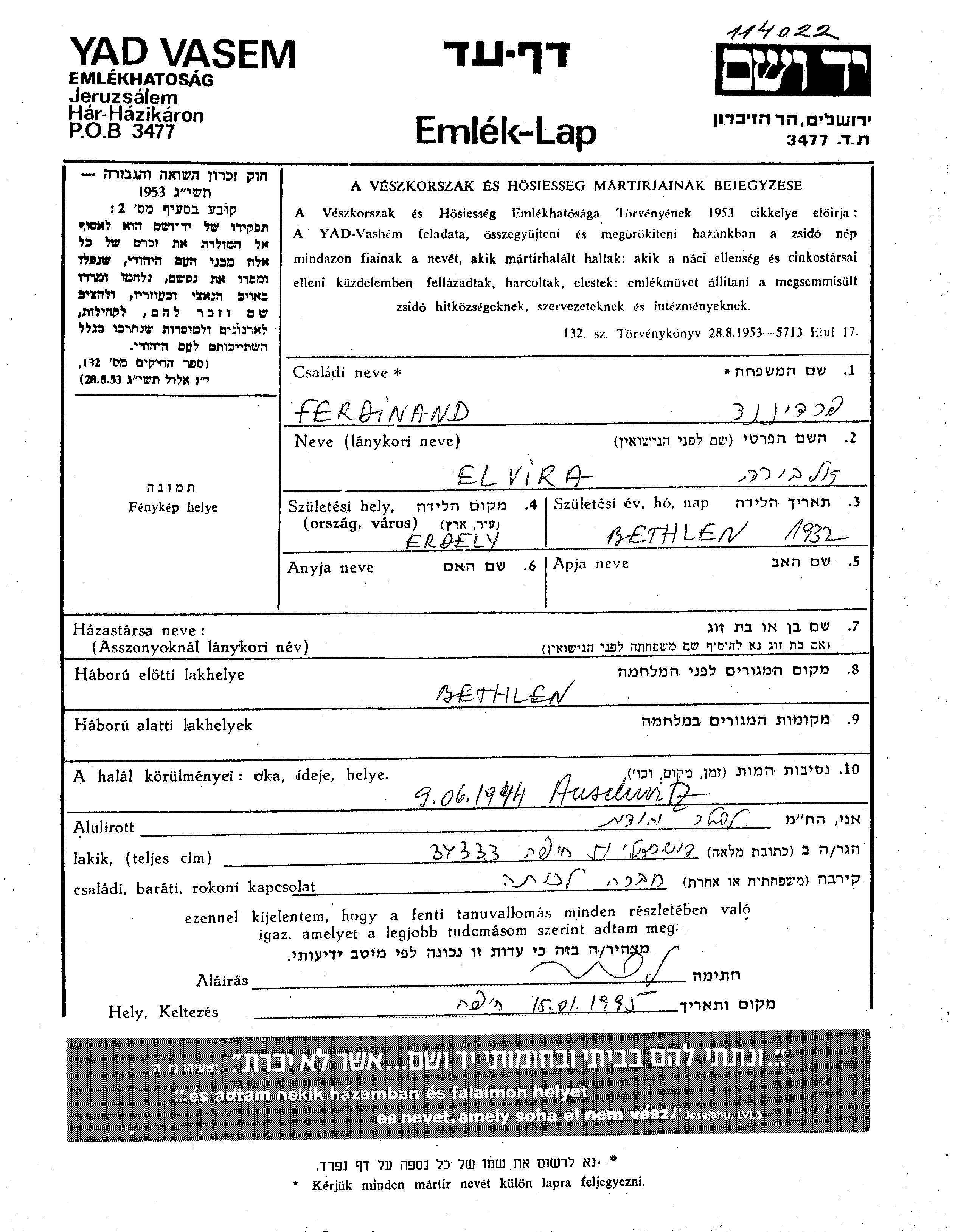 Ferdinand Elvira 1932 Bethlen, Roumanie Feuille de témoignage