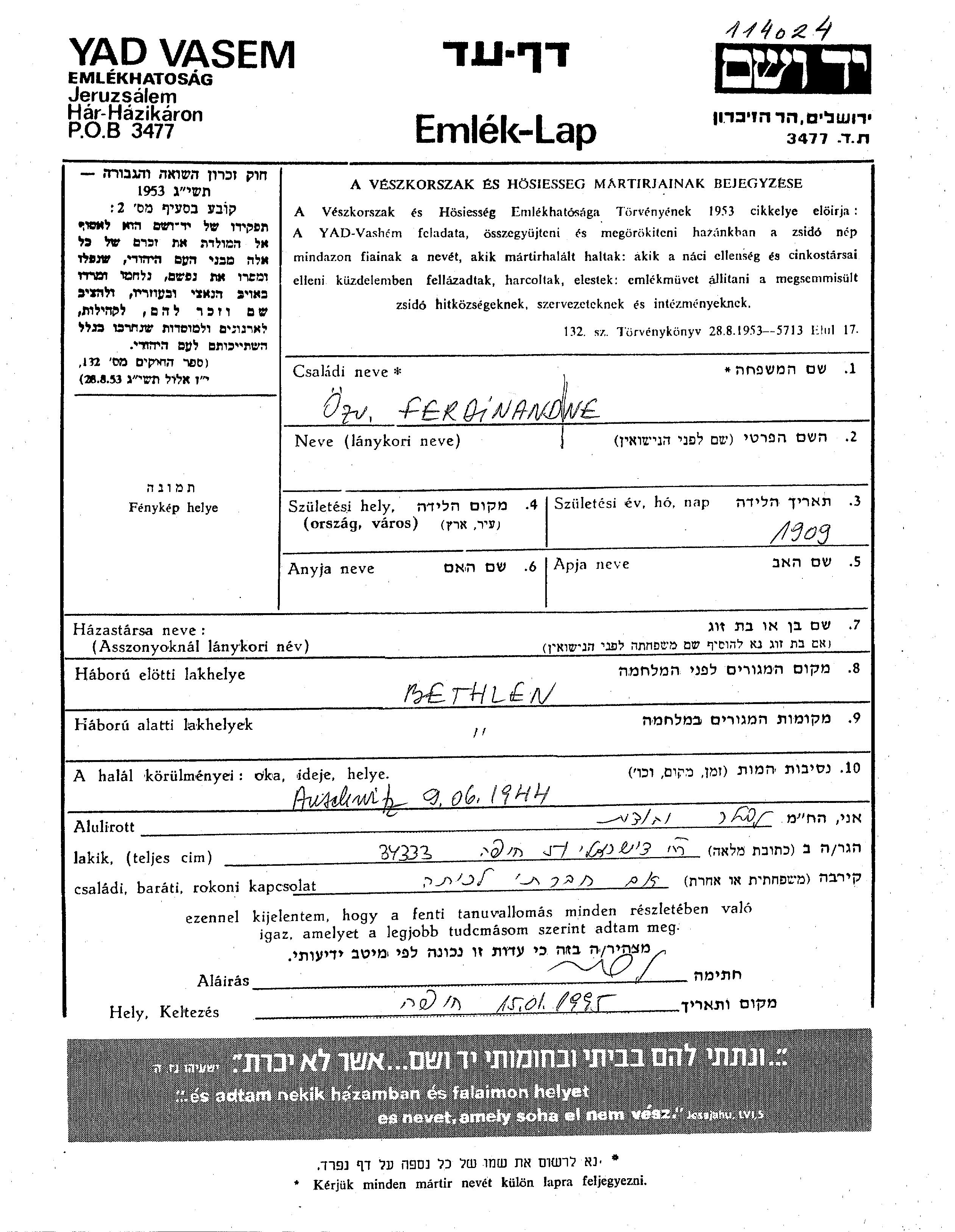 Ferdinand prénom inconnu 1909 Bethlen, Roumanie Feuille de témoignage