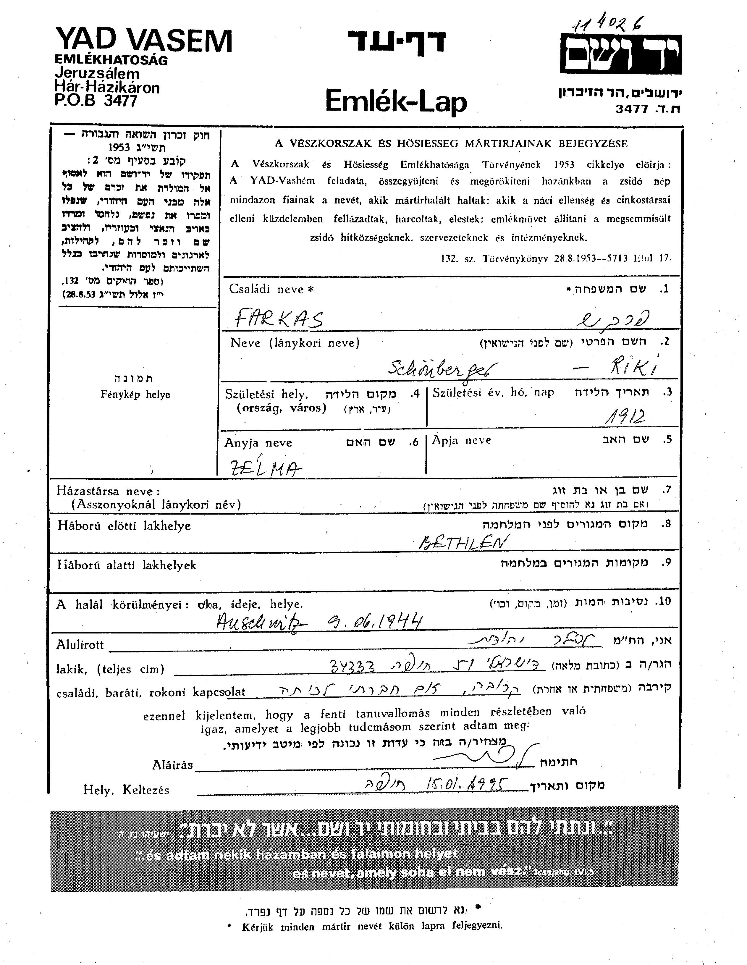 Riki Farkas née Schoenberger est née en 1912, fille de Zelma. Elle était Mariée à Dezso David. Avant la seconde guerre mondiale elle vivait à Bethlen, Roumanie.
