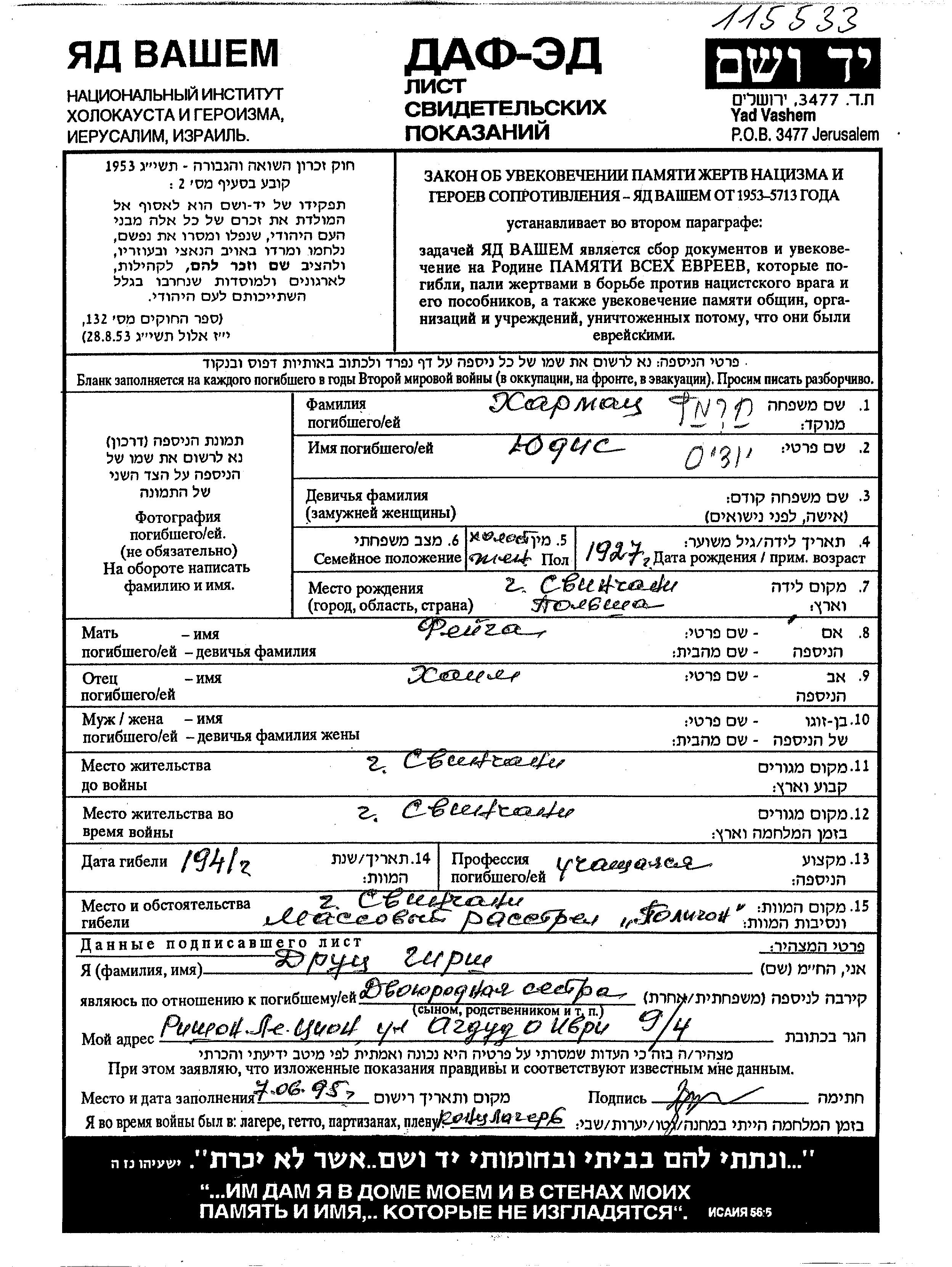 Yad Vashem - Pages of Testimony Names Memorial Collection