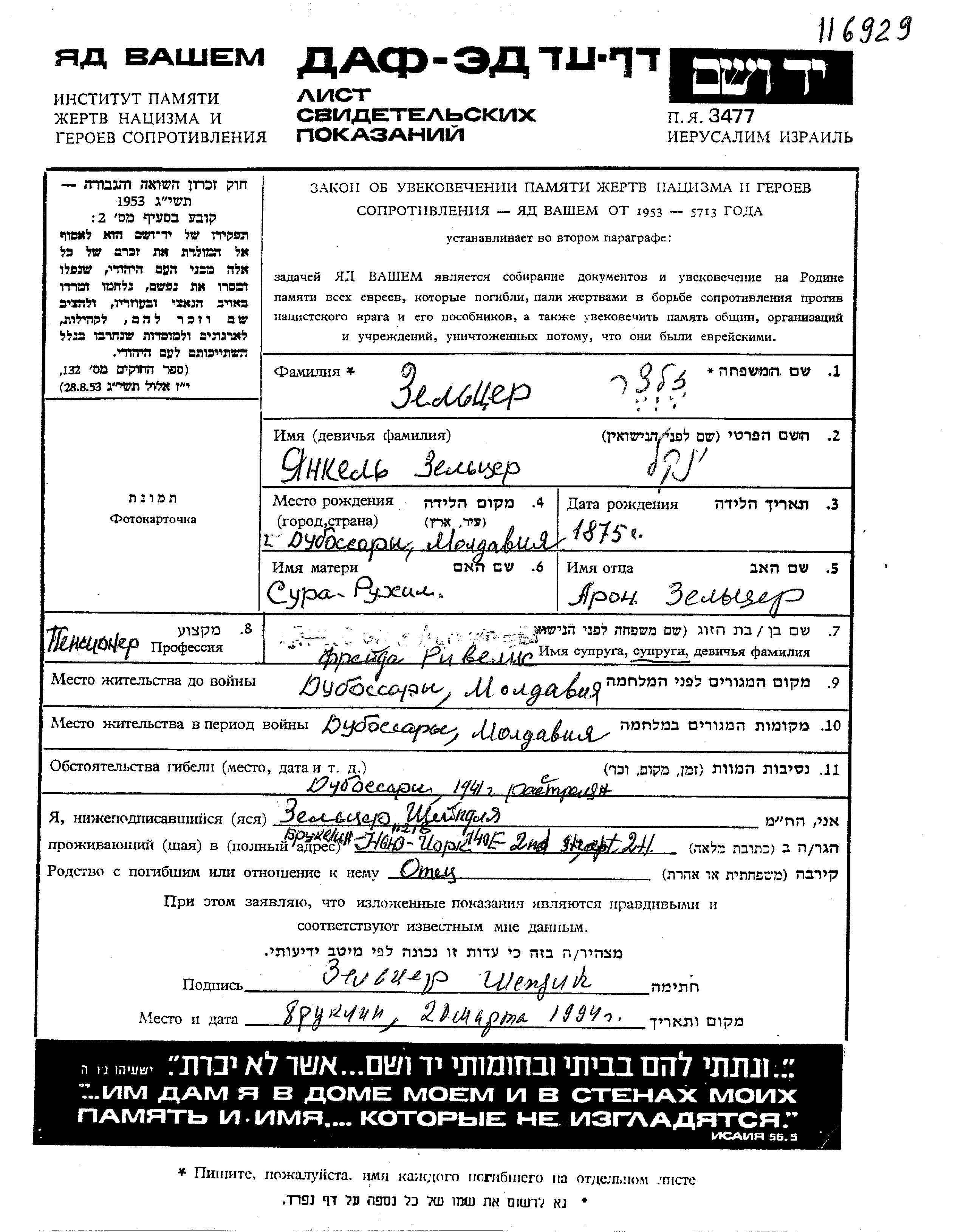Zeltzer Yankel 1875 Dubossary, Ukraine (URSS) Feuille de témoignage