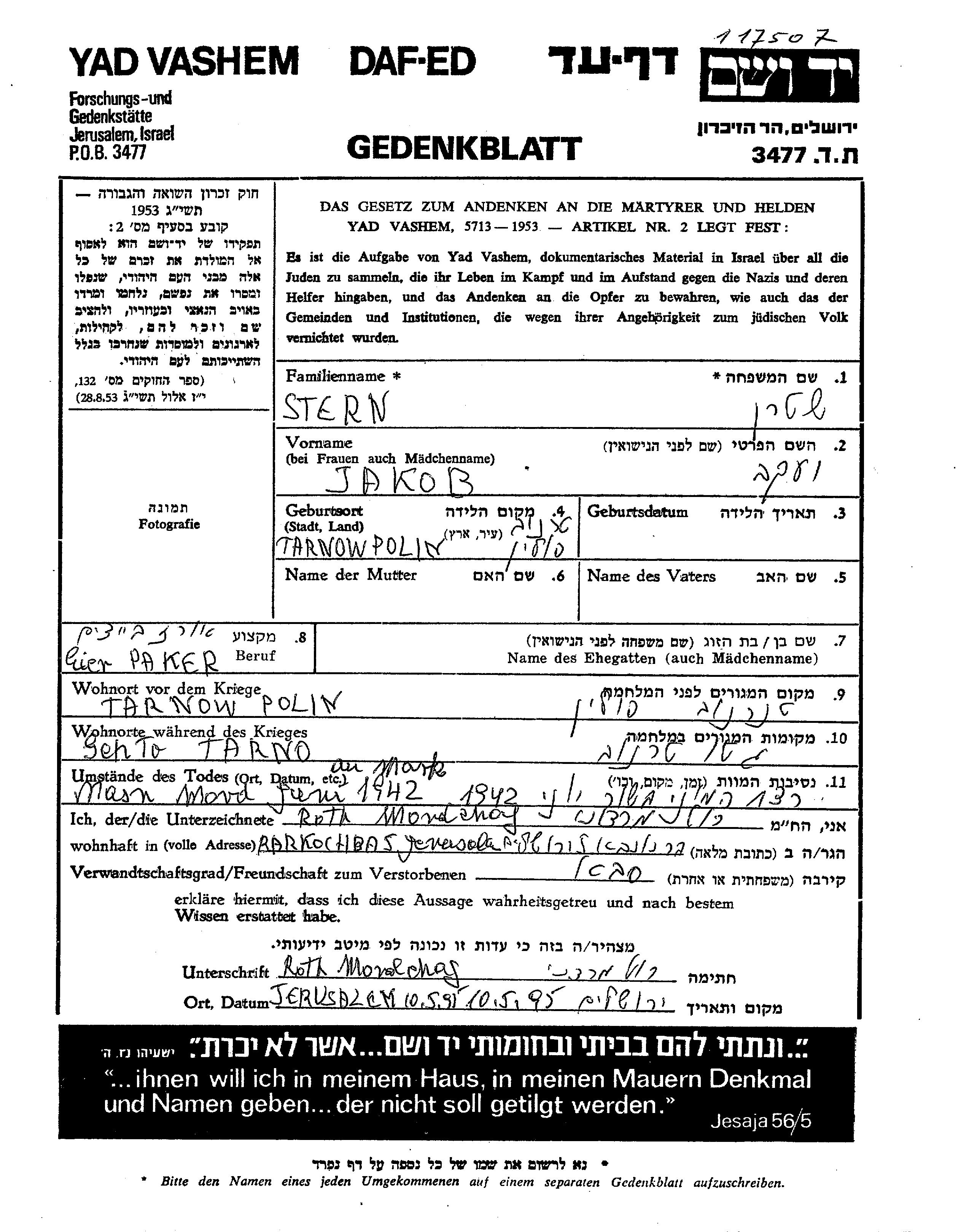 Stern Jakob Tarnow, Pologne Feuille de témoignage