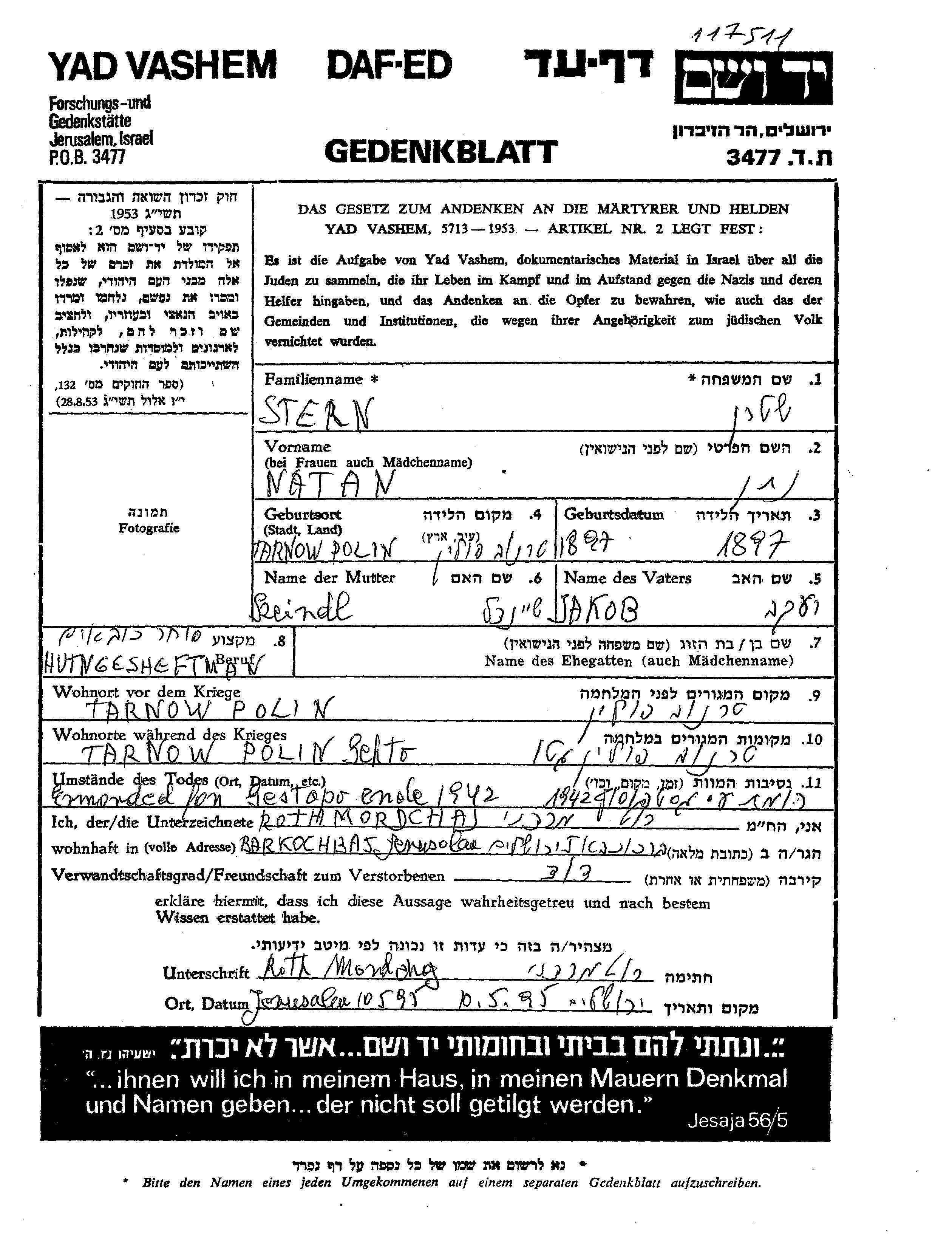 Stern Natan Tarnow, Pologne Feuille de témoignage
