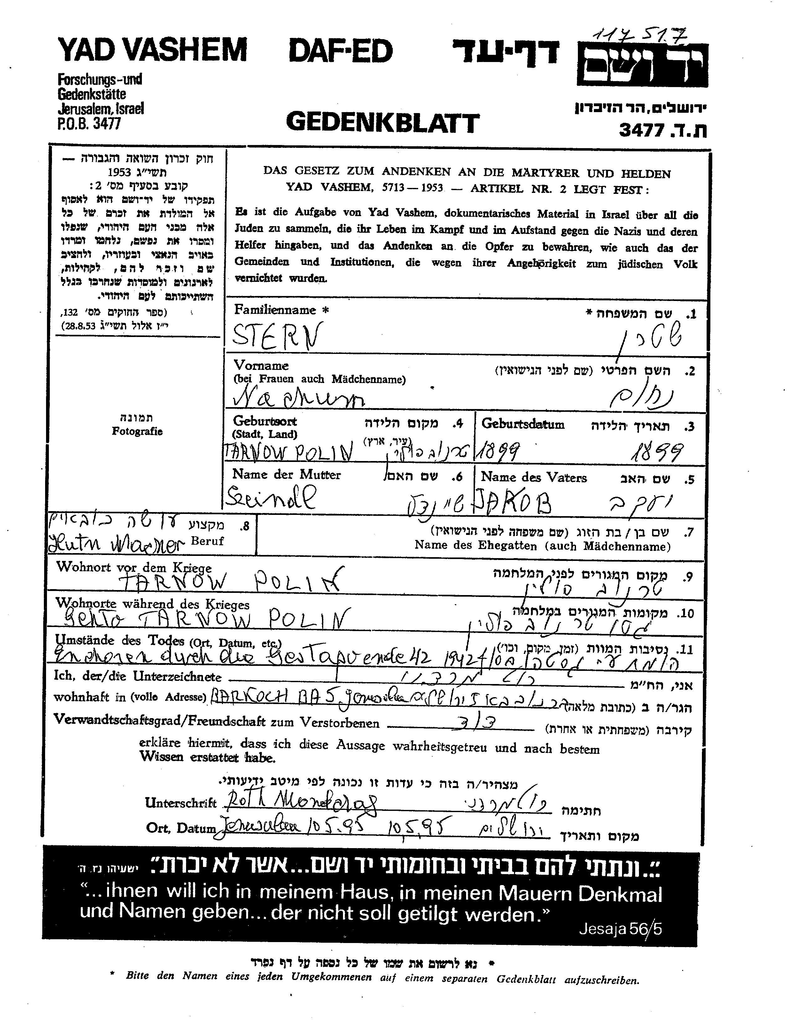 Stern Nachum 1899 Tarnow, Pologne Feuille de témoignage