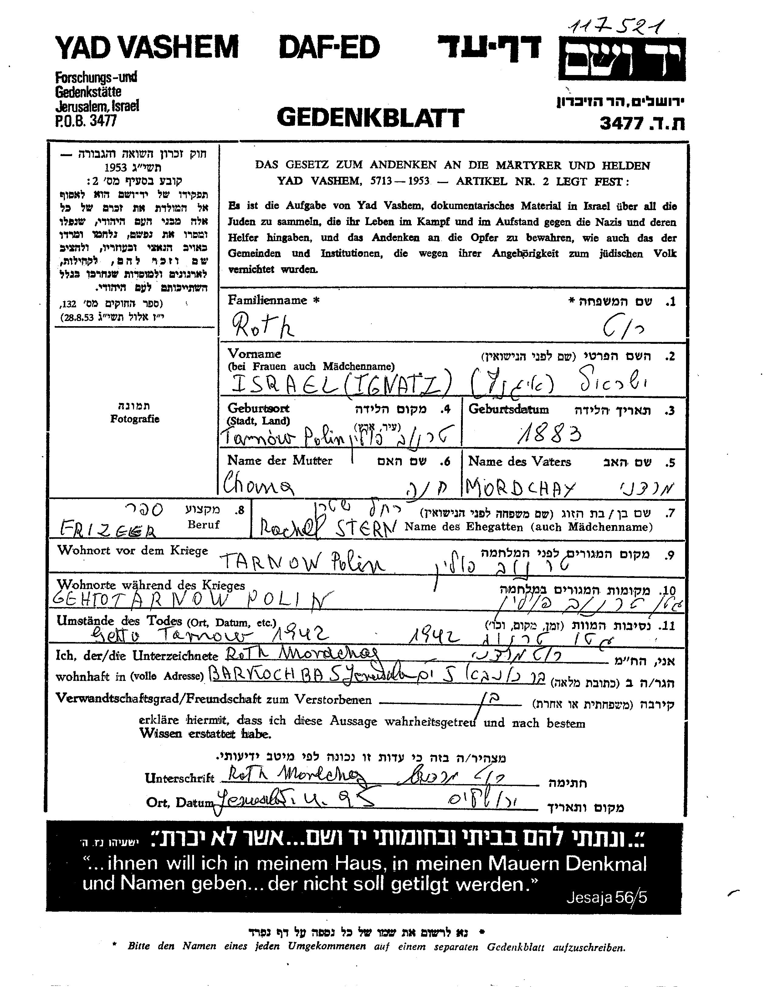 Roth Rut Israel Ignatz 1883 Tarnow, Pologne Feuille de témoignage