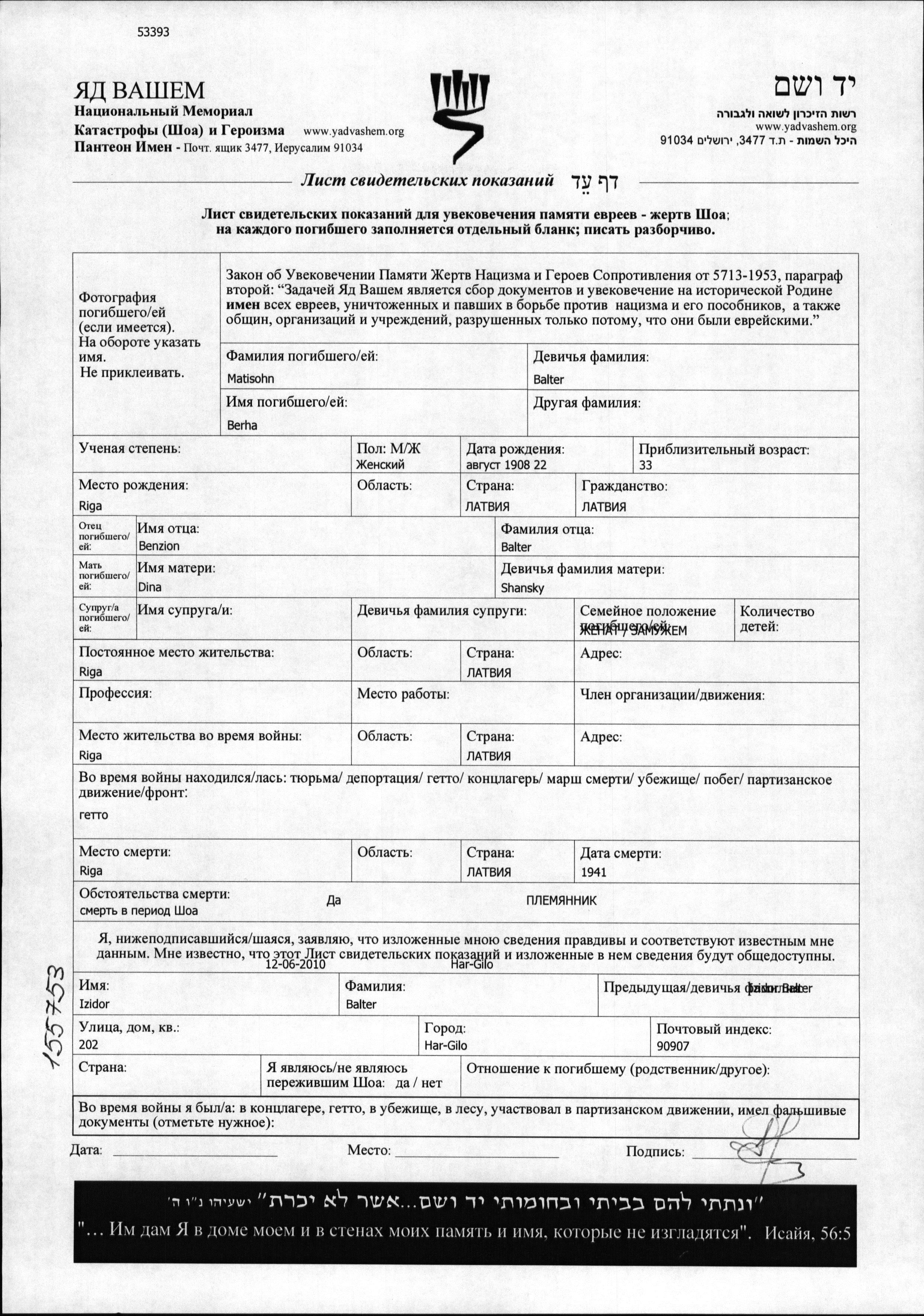 Bertha Matisohn née Balter est née à Riga, Lettonie en 1908, fille de Benzion et de Dina née Shansky. Elle était Mariée. Avant la seconde guerre mondiale elle vivait à Riga, Lettonie. Pendant la guerre, elle était à Riga, Lettonie.