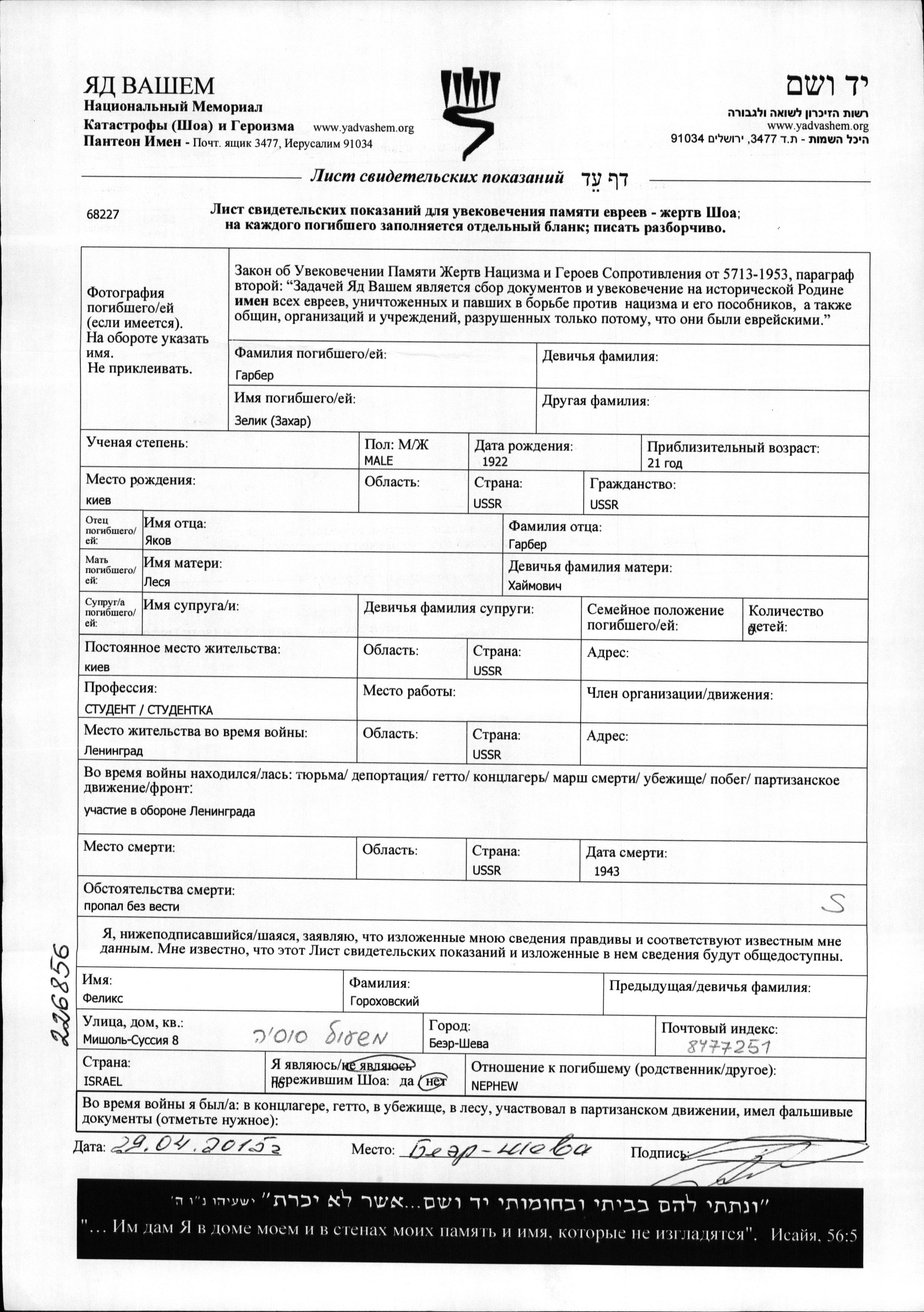 Garber Zelik Zakhar 1922 Kiev, Ukraine (URSS) Feuille de témoignage