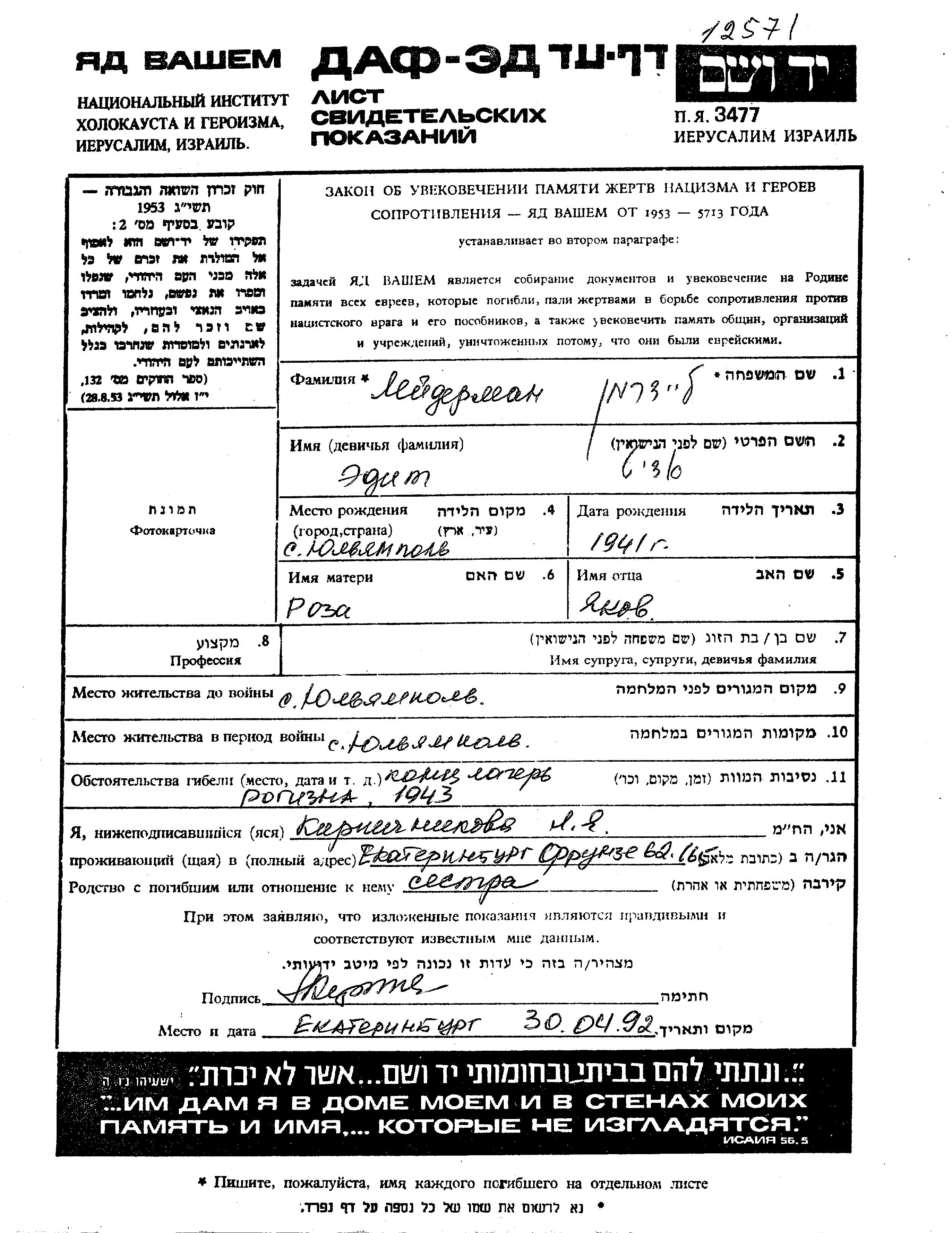 Leiderman Edit 1941 Yuliampol, Ukraine (URSS) Feuille de témoignage
