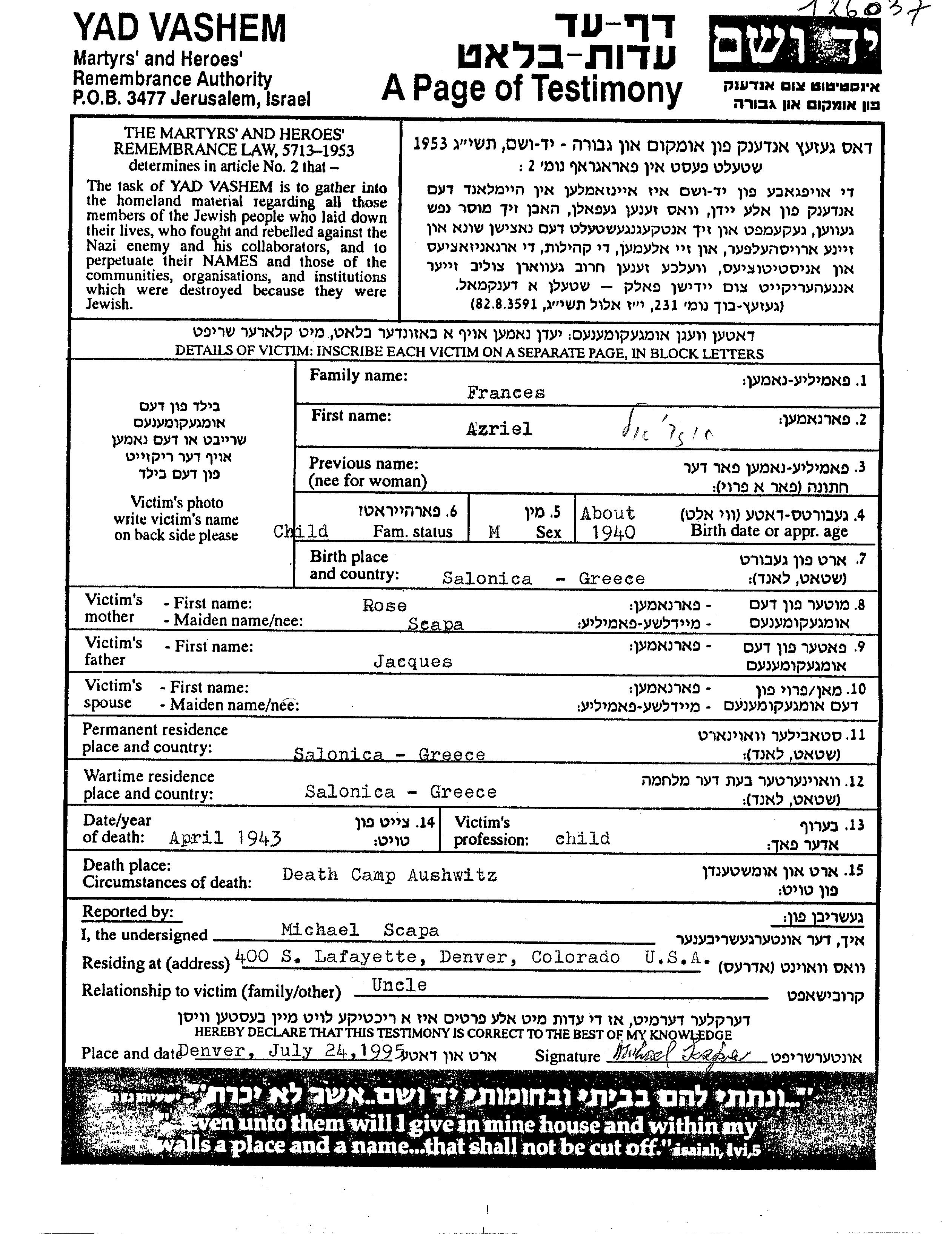 Azriel Frances est né à Saloniki, Grèce en 1940, fils de Jacques et de Roza née Scapa. Il était Enfant. Avant la seconde guerre mondiale il vivait à Saloniki, Grèce. Au cours de la guerre, il était à Saloniki, Grèce.