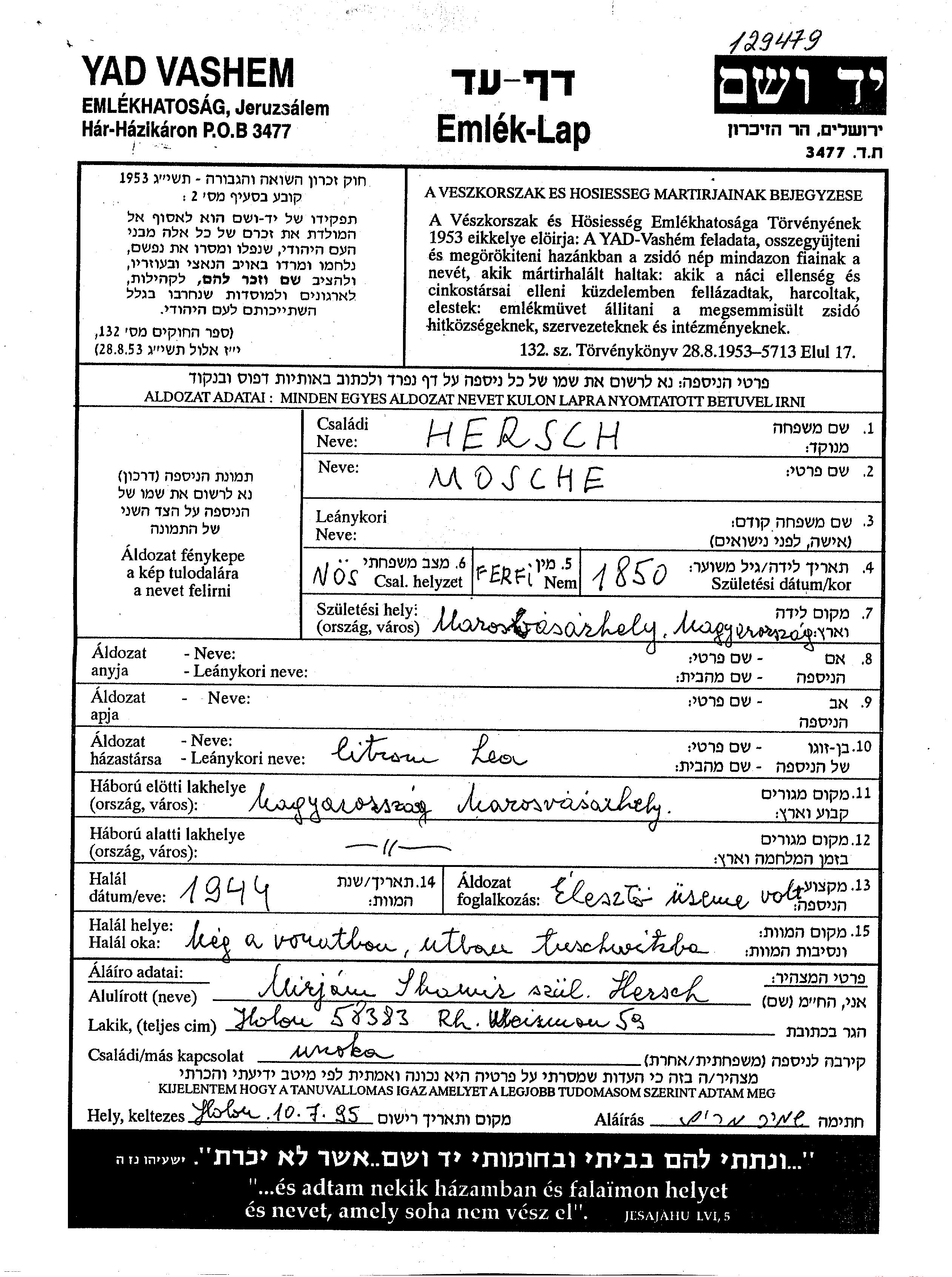Mosche Hersch est né à Marosvasarhely, Roumanie en 1850. Il était Artisan et Mariée à Lea. Avant la seconde guerre mondiale il vivait à Marosvasarhely, Roumanie. Au cours de la guerre, il était à Marosvasarhely, Roumanie.